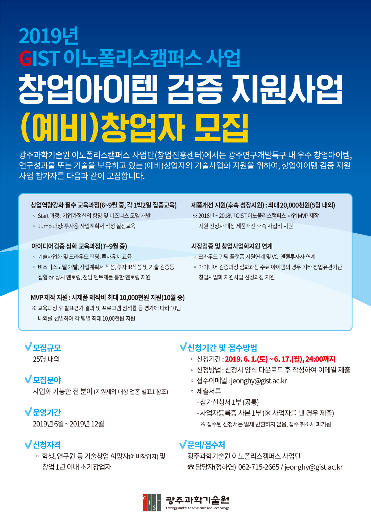 광주과학기술원 이노폴리스캠퍼스 사업단(창업진흥센터)에서는 광주연구개발특구 내 우수 창업아이템, 연구성과물 또는 기술을 보유하고 있는 (예비)창업자의 기술사업화 지원을 위하여, 창업아이템 검증 지원 사업 참가자를 다음과 같이 모집합니다.