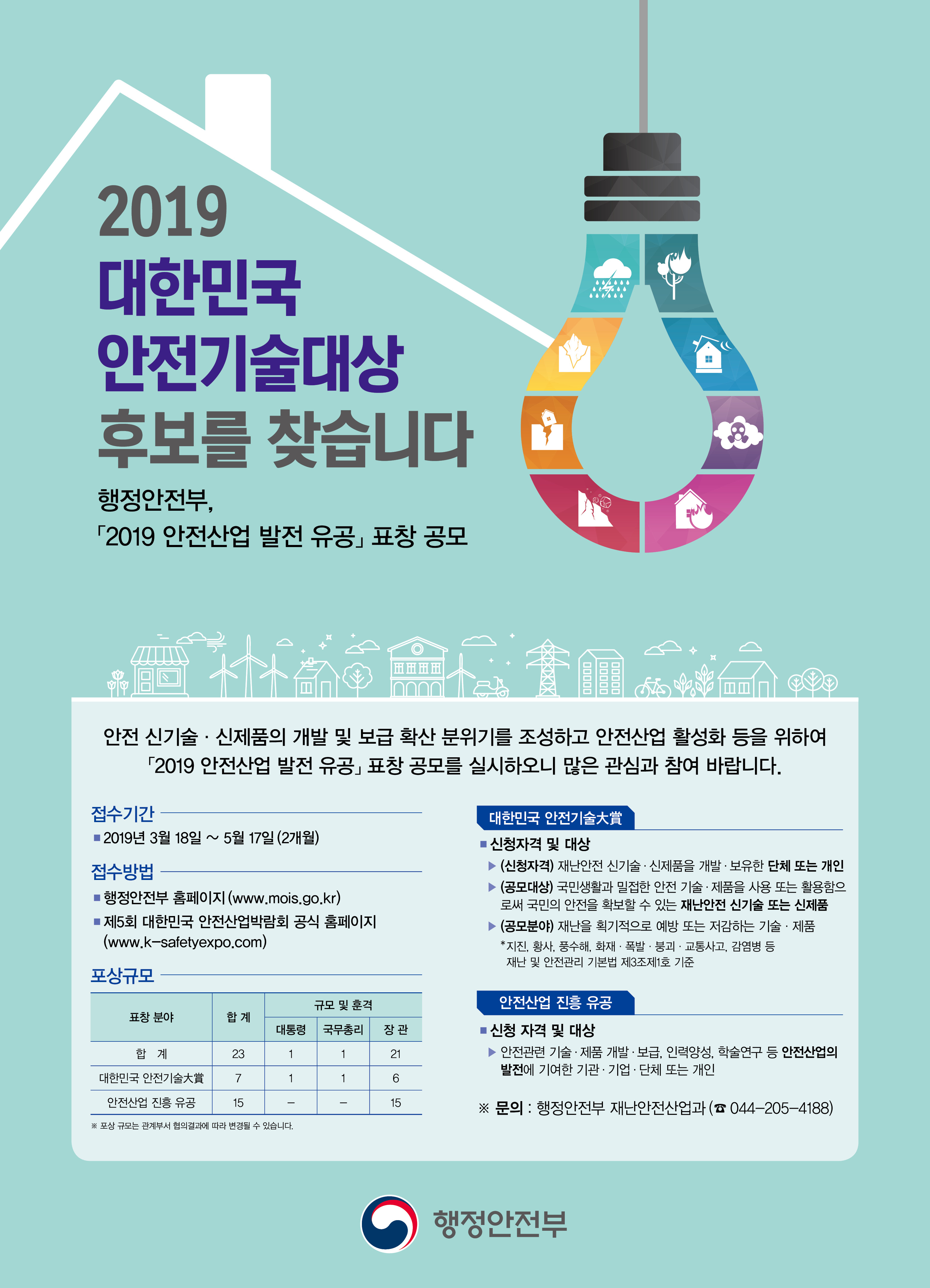 안전 신기술‧신제품 개발‧보급 확산 분위기를 조성하고 안전산업 활성화 등을 위하여 안전산업 발전에 공헌한 우수 기업‧단체 및 개인을 발굴‧시상하고자「2019 안전산업 발전 유공」표창을 시행하오니 많은 관심과 참여 바랍니다.
