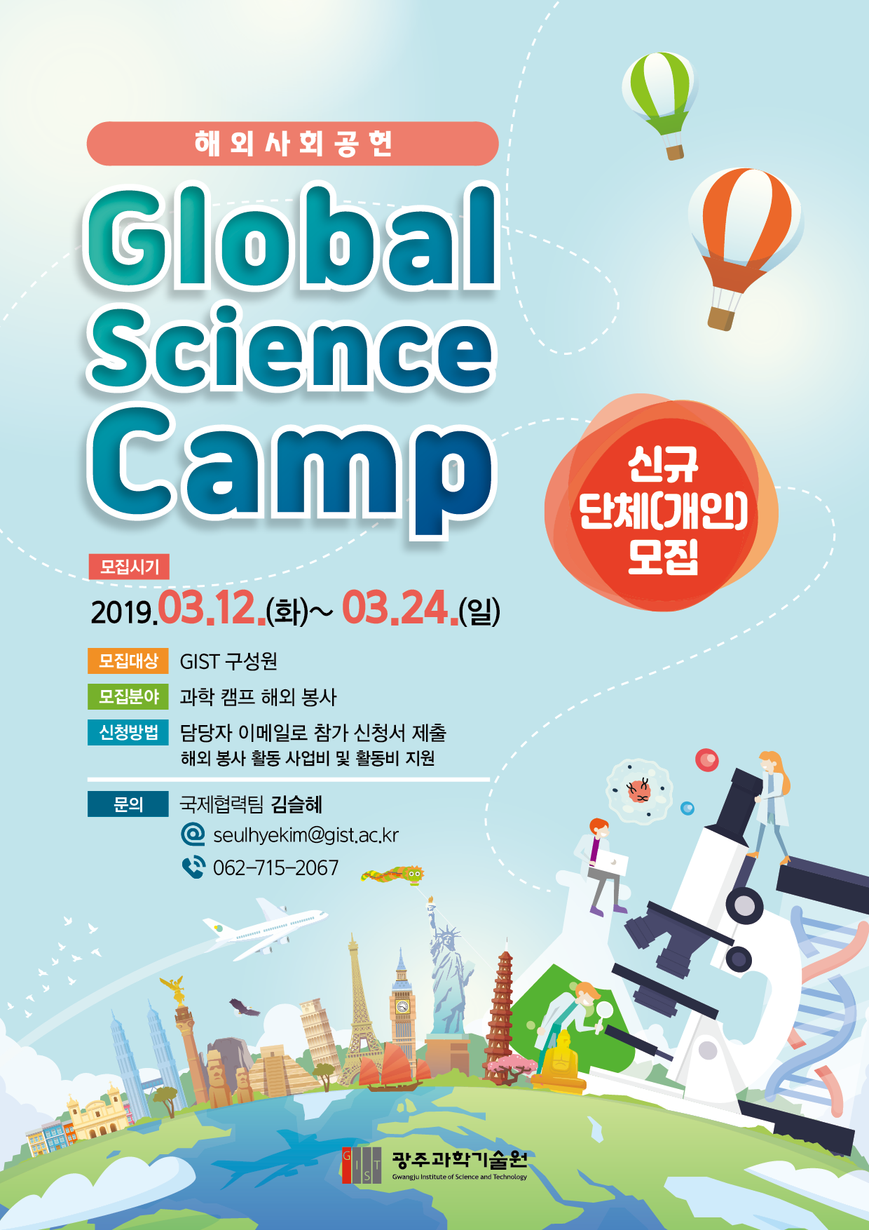 GIST 해외사회공헌단은 사회공헌 활동에 대한 GIST구성원의 해외봉사 사업을 지원하기 위하여 2019 해외 사회 공헌단 신규 단체 및 개인을 모집하오니 많은 참여 바랍니다.