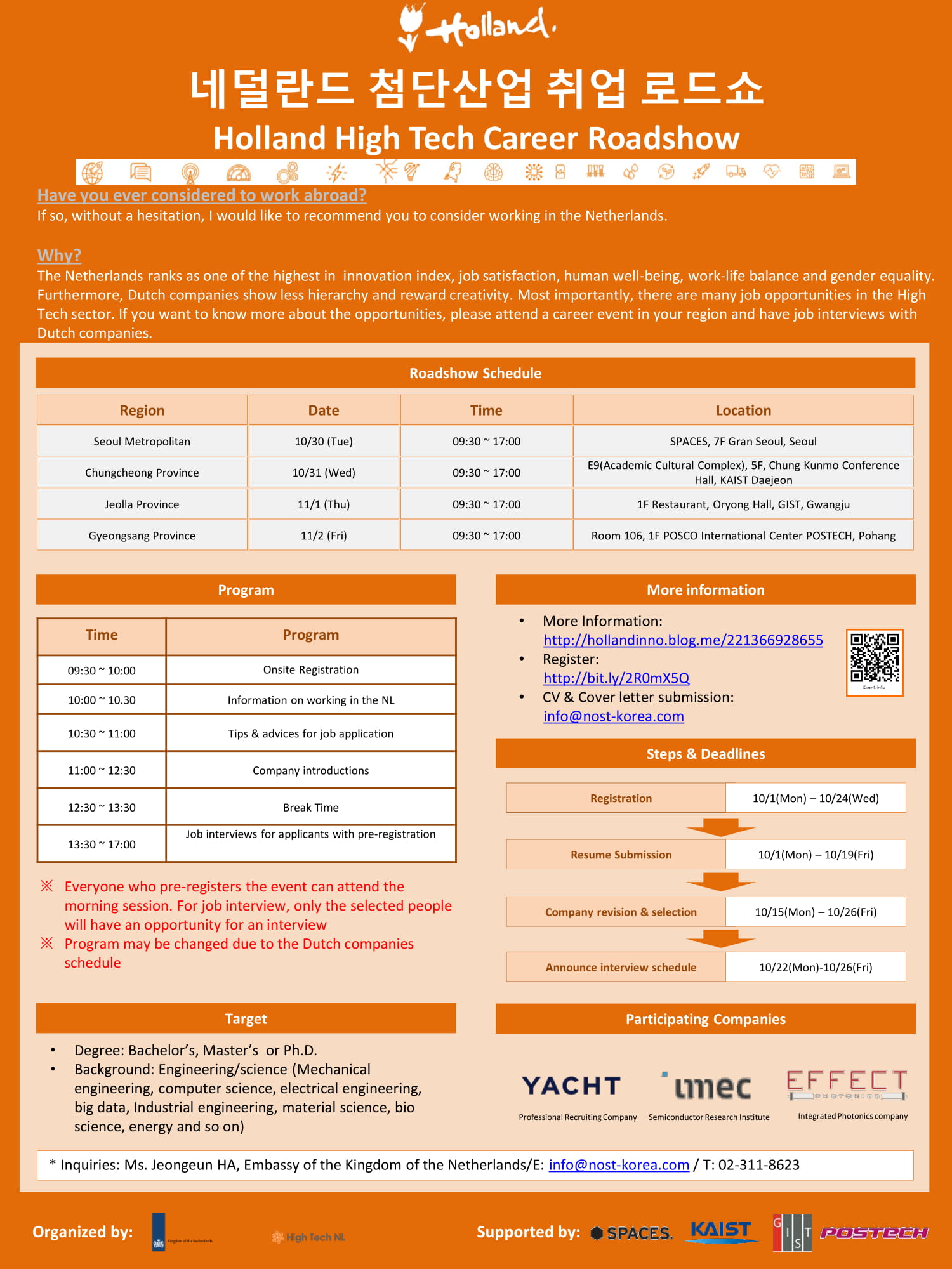 주한 네덜란드 대사관은 오는 2018.10.30(화)~11.2(금)까지 네덜란드 첨단산업 지원 기관인 High ech NL과 공동으로 "네덜란드 첨단산업 취업 로드쇼"를 실시합니다.