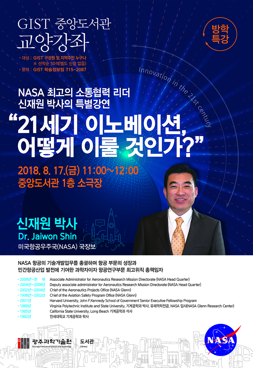 그 두 번째 강연으로 NASA(미국항공우주국) 국장보 신재원 박사님을 모시고