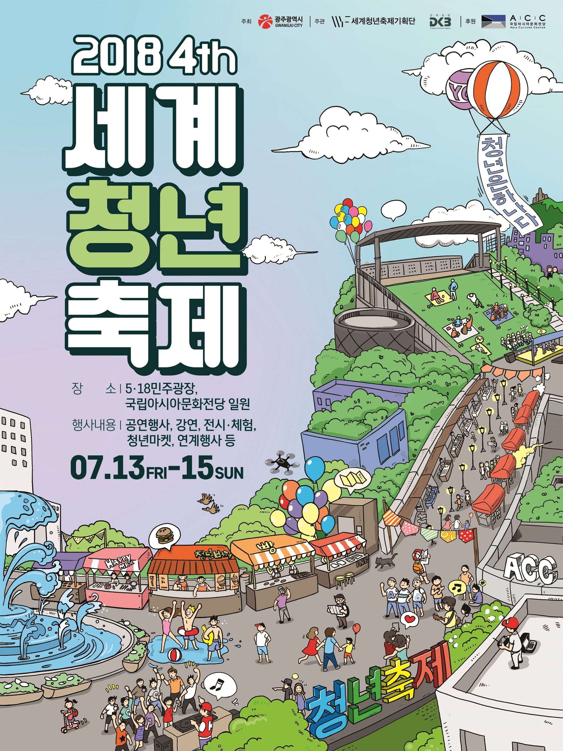 광주시에서는 2018 세계청년축제를 7월 13일부터 3일간 518 민주광장 및 국립 아시아문화전당 일원에서 개최할 계획입니다.