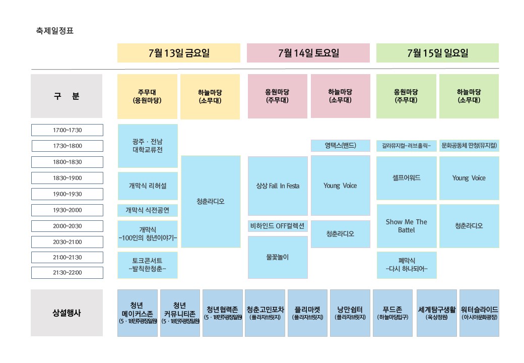 주요행사로는 공연, 강연, 전시체험, 청년마켓, 연계행사 등이 있으며 자세한 내용은 첨부문서를 참조하시기 바랍니다.