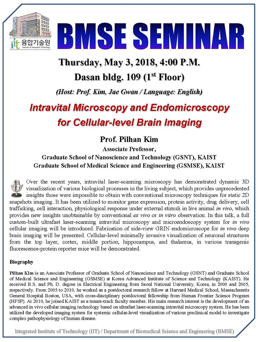 - 주제: Intravital Microscopy and Endomicroscopy for Cellular-level Brain Imaging