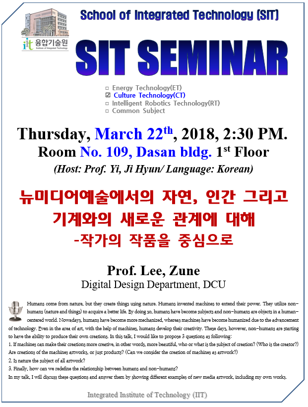 [융기원-융합기술학제학부] SIT Seminar, 3/22(Thurs.14:30~)/ Prof. Zune Lee(DCU)/ Dasan bldg. #109