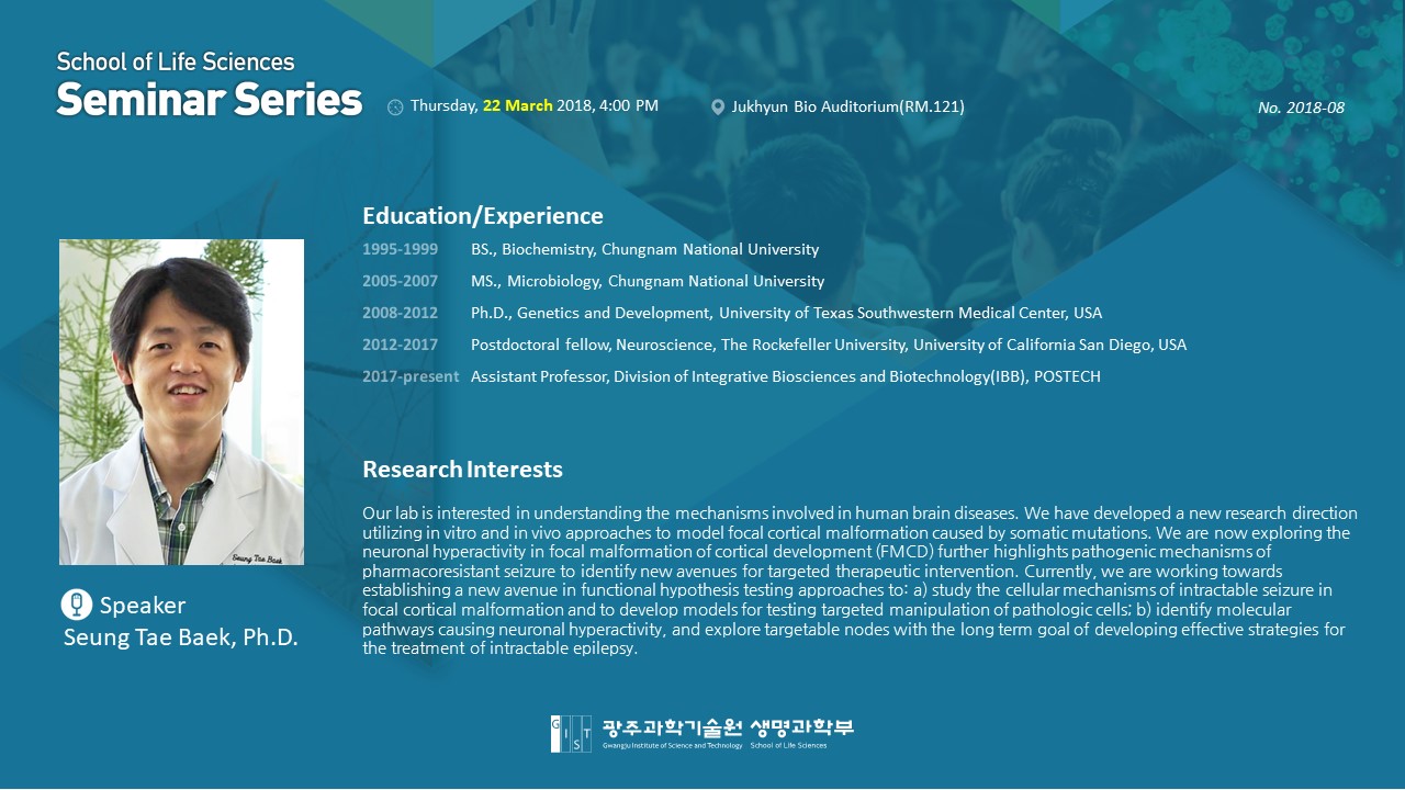 [생명과학부 Seminar-8] 2018.3.22.(Thu) 4:00pm, Seung Tae Baek, PhD