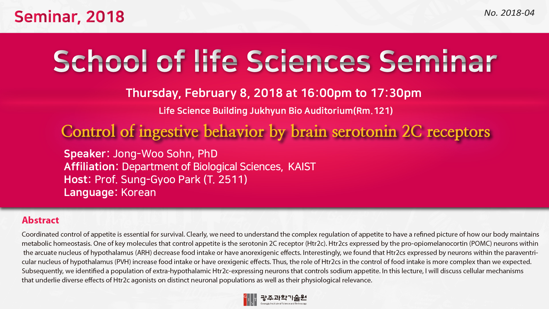 [생명과학부 Seminar-4] 2018.2.8.(Thu) 4:00pm, Jong-Woo Sohn, PhD