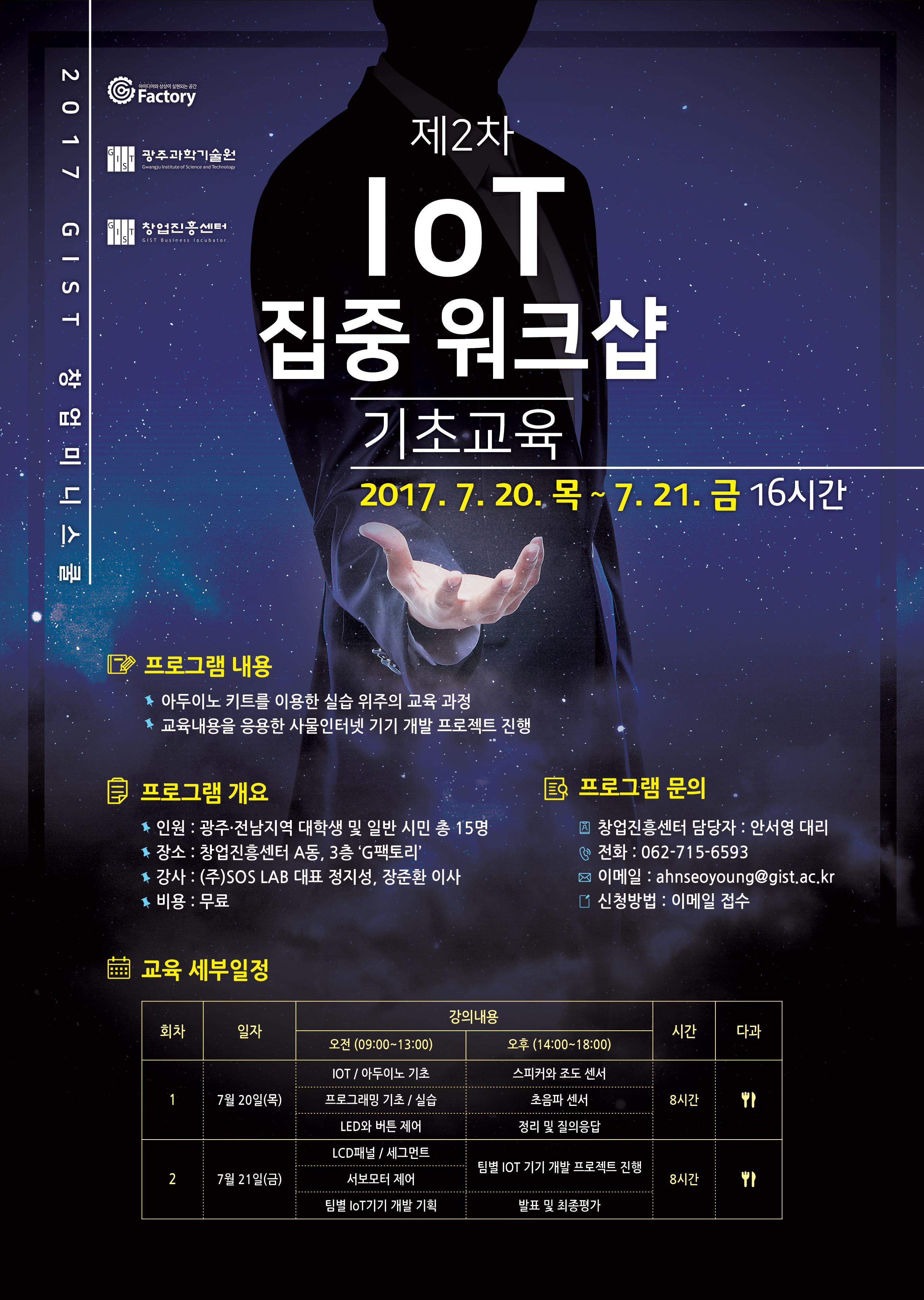 7월 20일 ~ 21일 IoT를 주제로 창업미니스쿨을 가질 예정입니다. 이번 교육은 광주·전남지역 대학생 및 일반 시민, BI 입주기업 모두 수강할 수 있습니다. 많은 관심과 참여바랍니다.