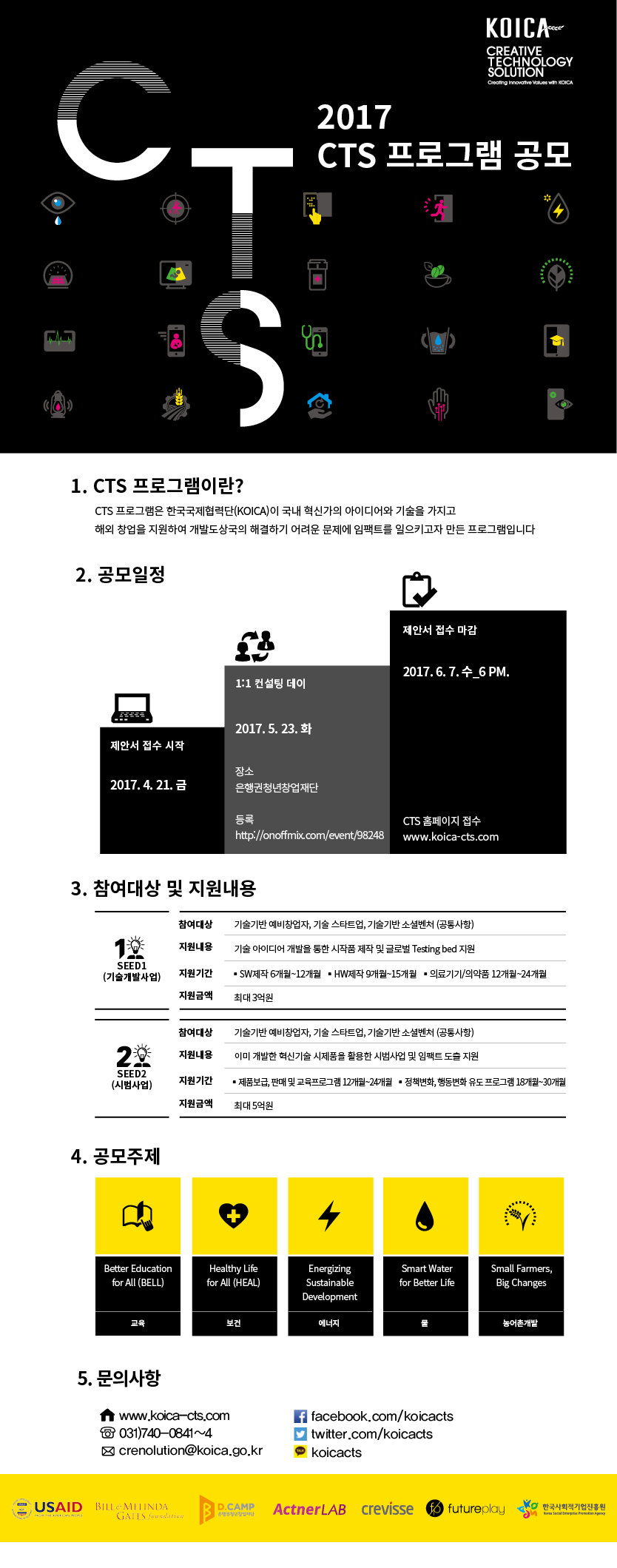 CTS프로그램은 한국국제협력단(KOICA)이 국내혁신가의 아이디어와 기술을 가지고 해외 창업을 지원하여 개발도상국의 어려운 문제를 효과적으로 해결하고자 만든 프로그램입니다. 기술 기반 예비창업자, 기술스타트업, 기술기반 소셜벤처 등이 지원할 수 있으며 사업에 선정되면 은행권청년창업재단(D.CAMP) 내 창업 공간과 함께 Seed1(기술개발사업)은 최대 3억원, Seed2(시범사업)는 최대 5억원의 사업비를 지원받을 수 있습니다.