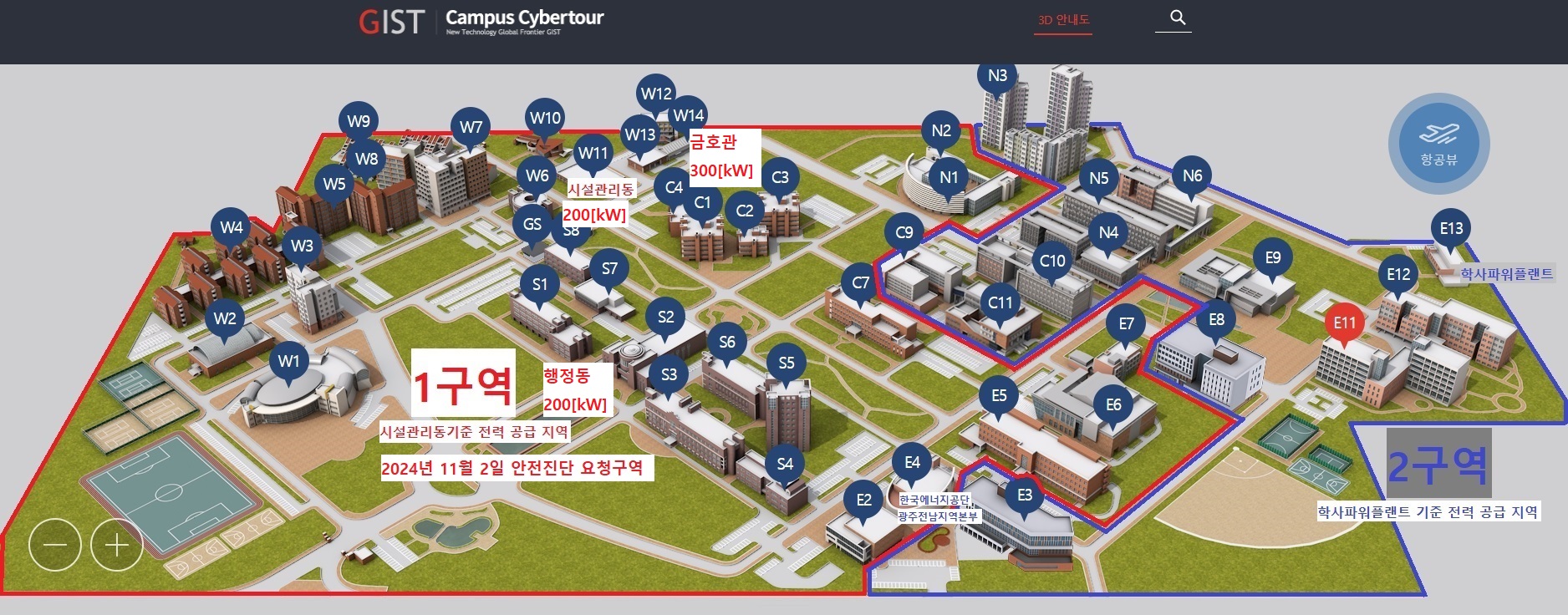 라. 정전건물 : 전컴 A/B/C, 신소재, 생명동, 환경에너지공학동, 기계로봇공학동, 고등광기술연, 극초단연구동, 금호관,
