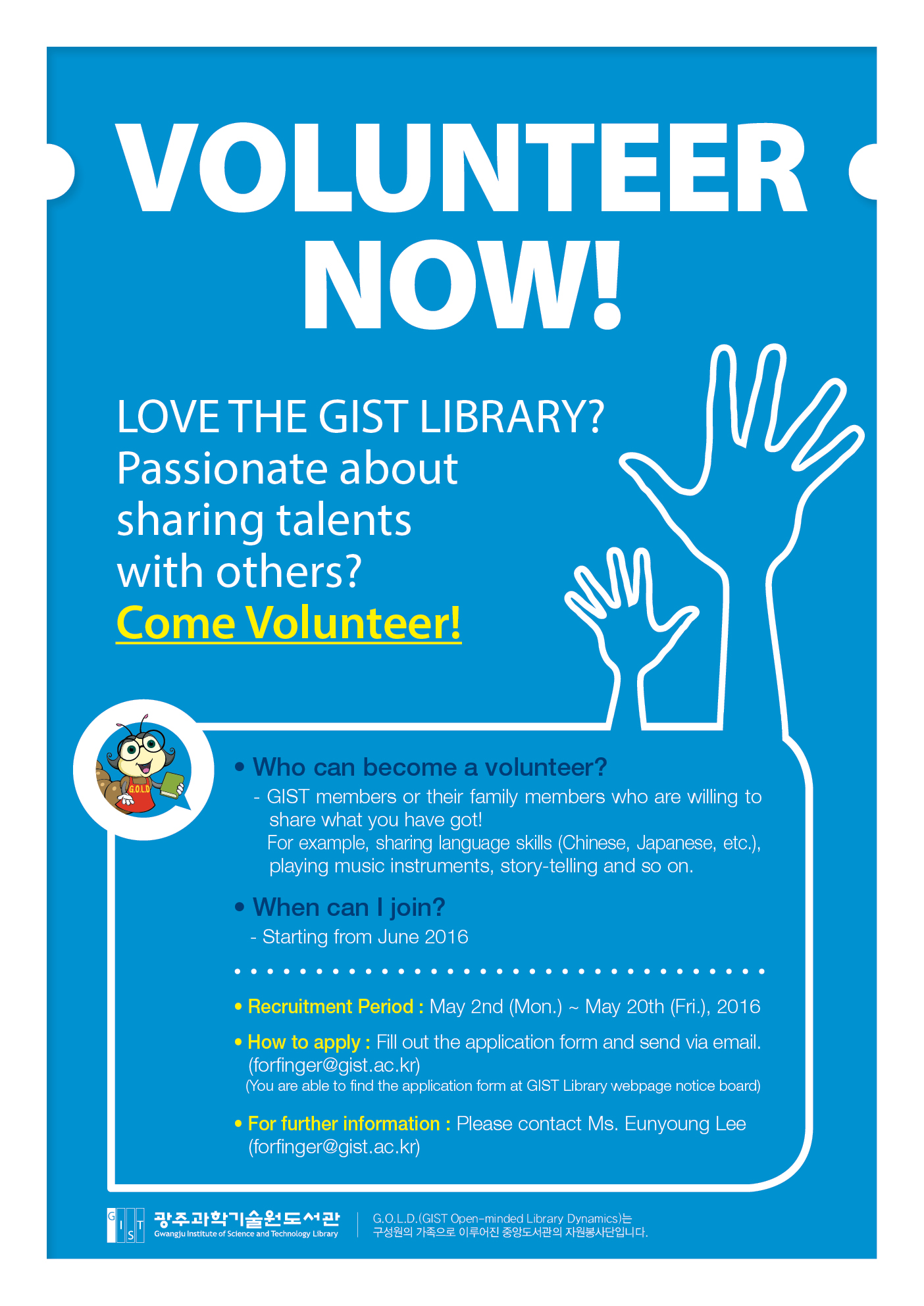 GIST 중앙도서관에서 자원봉사단(G.O.L.D) 2기를 모집 합니다.