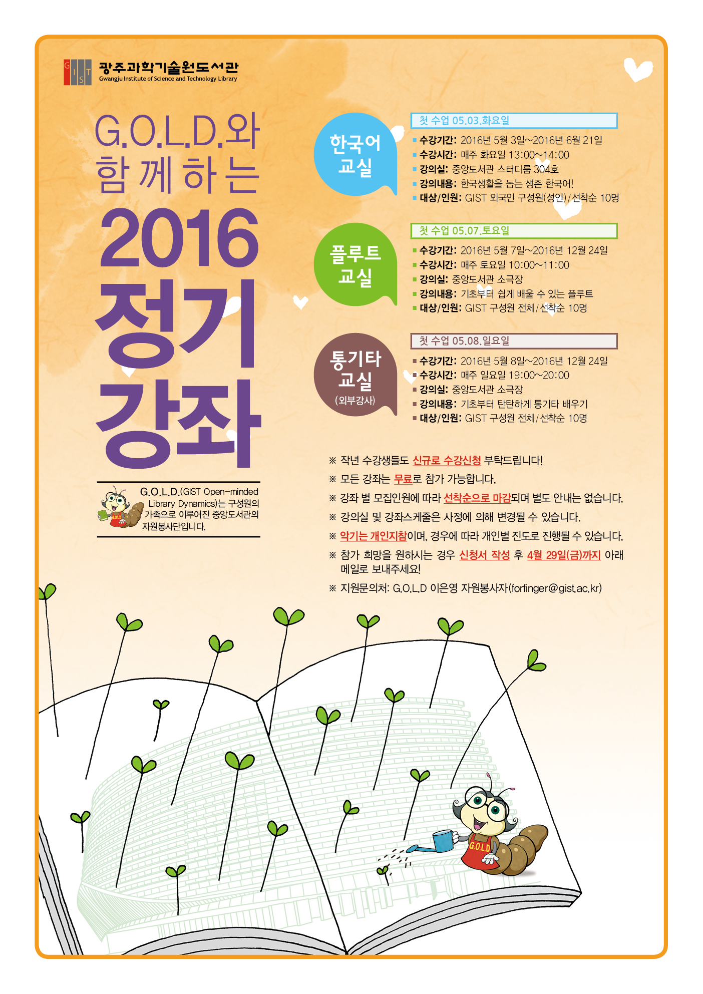 GIST 중앙도서관 자원봉사단(G.O.L.D)에서 주관하는 정기강좌 프로그램입니다.