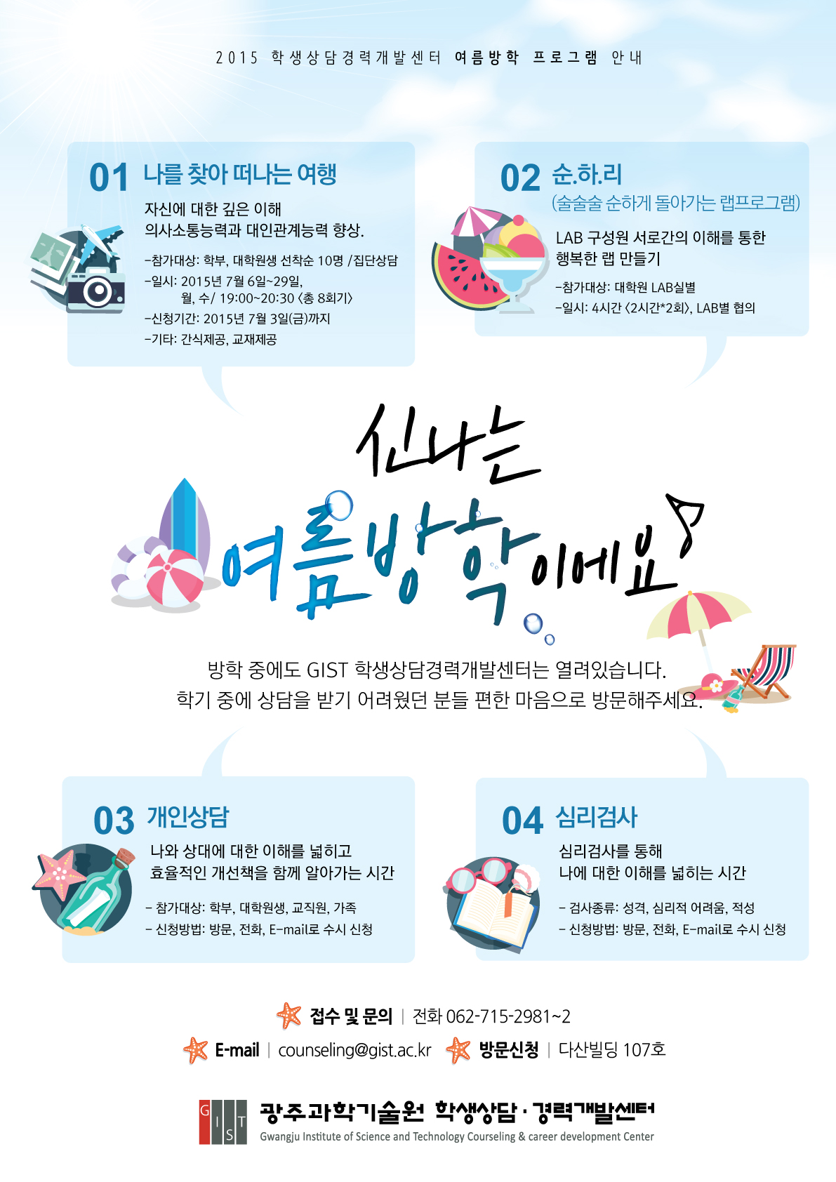 *신청방법 : 전화 715-2981~2, e-mail counseling@gist.ac.kr, 직접방문접수(다산 107호)