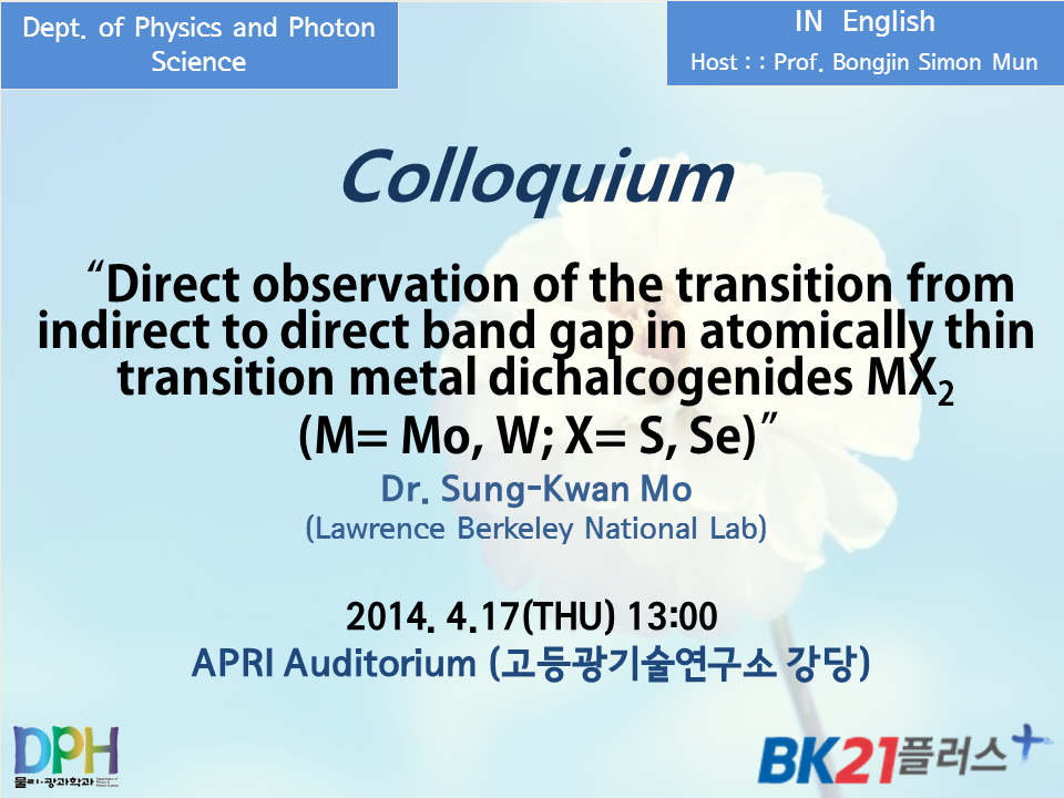 * Speaker: Dr. Sung-Kwan Mo (Advanced Light Source, Lawrence Berkeley National Lab, USA)