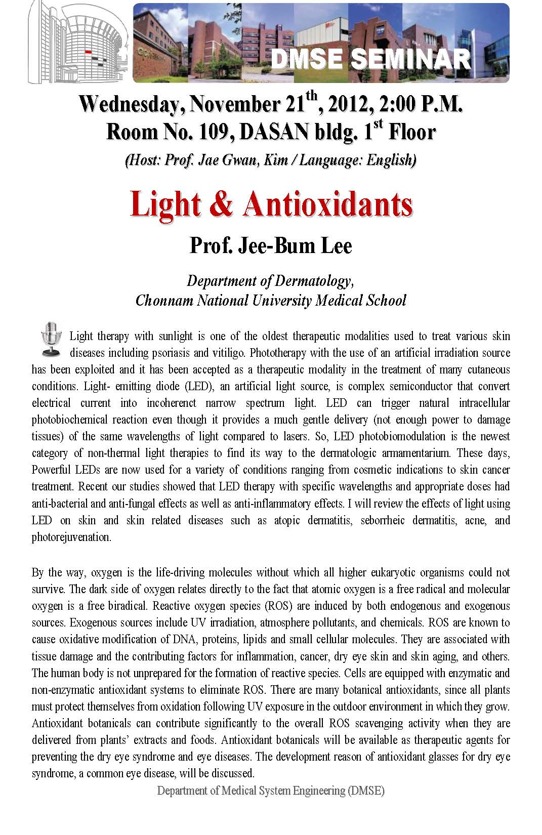 [DMSE Seminar] *11/21(Wed) 2:00P.M. / Light & Antioxidants / Prof. Jee-Bum Lee / Dasan Bldg.#109
