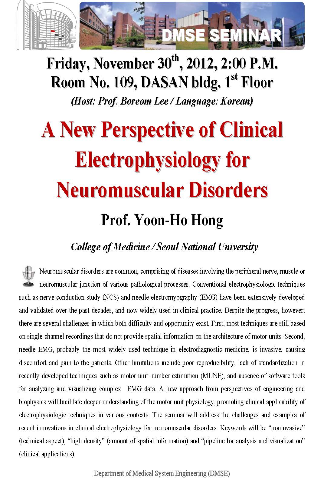 [DMSE Seminar] *11/30(Fri) 2:00P.M. / A New Perspective of Clinical Electrophysiology for Neuromuscular Disorders / Prof. 홍윤호 / Dasan Bldg.#109