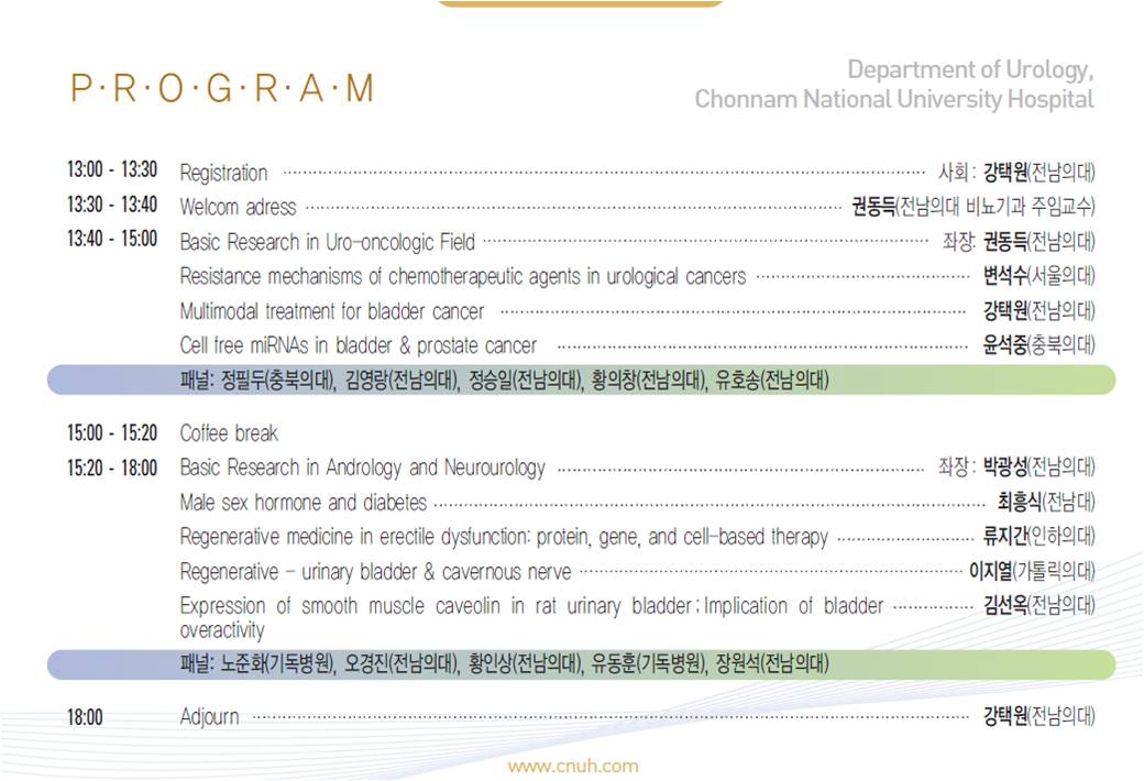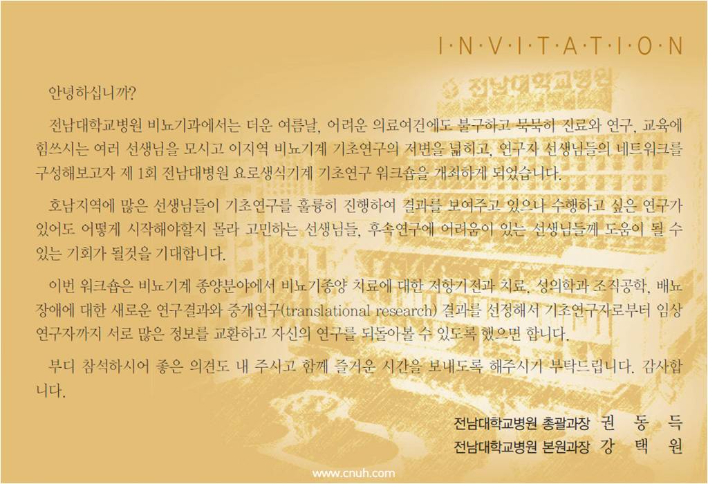 제1회 전남대학교병원 요로생식기계 기초연구 워크숍을 아래와 같이 안내하오니,
