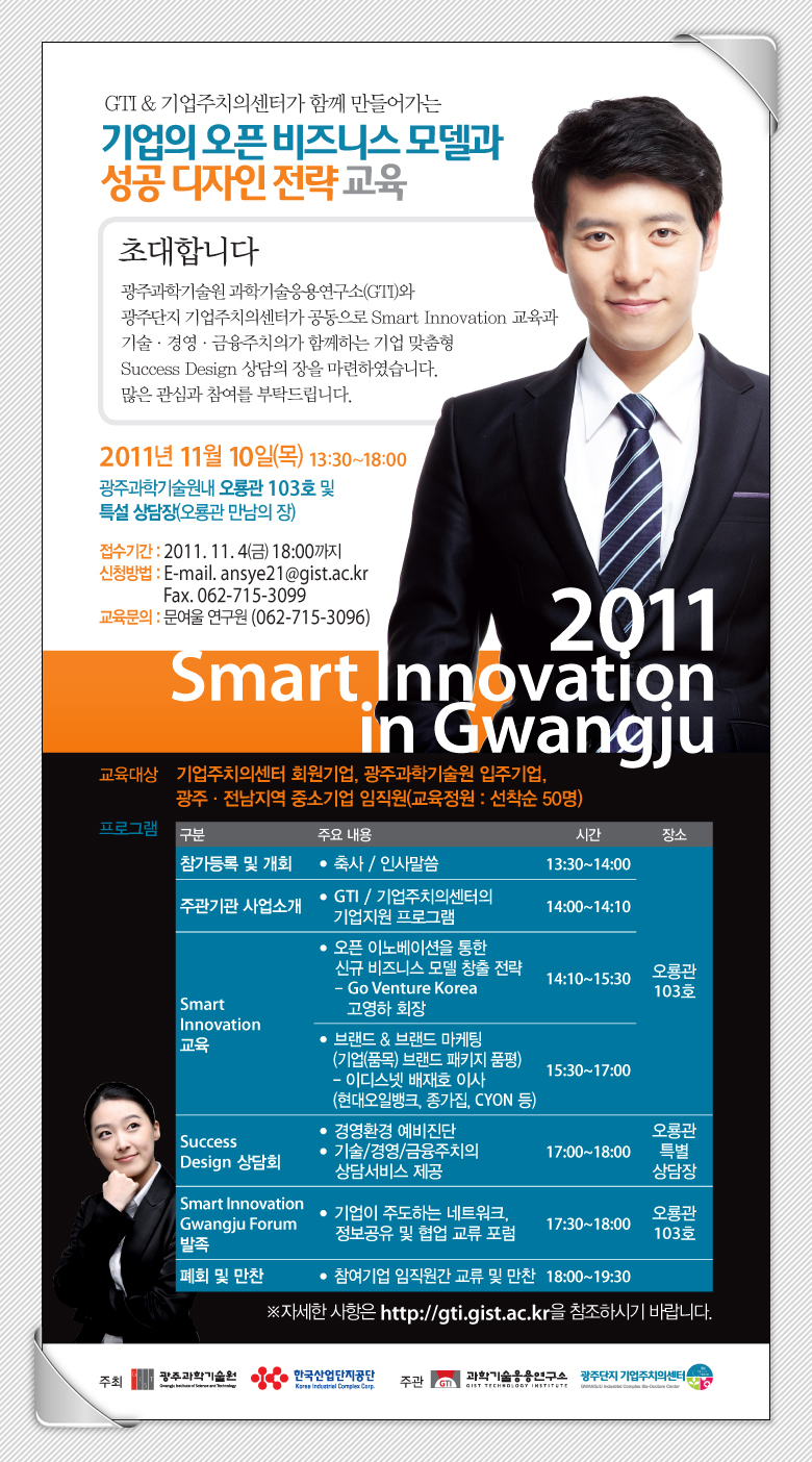 광주과학기술원 과학기술응용연구소(GTI)와 광주단지 기업주치의센터가 공동으로 Smart Innovation 교육과 기술 경영·금융주치의가 함께하는 기업 맞춤형 Success Design 상담의 장을 마련하였습니다.
