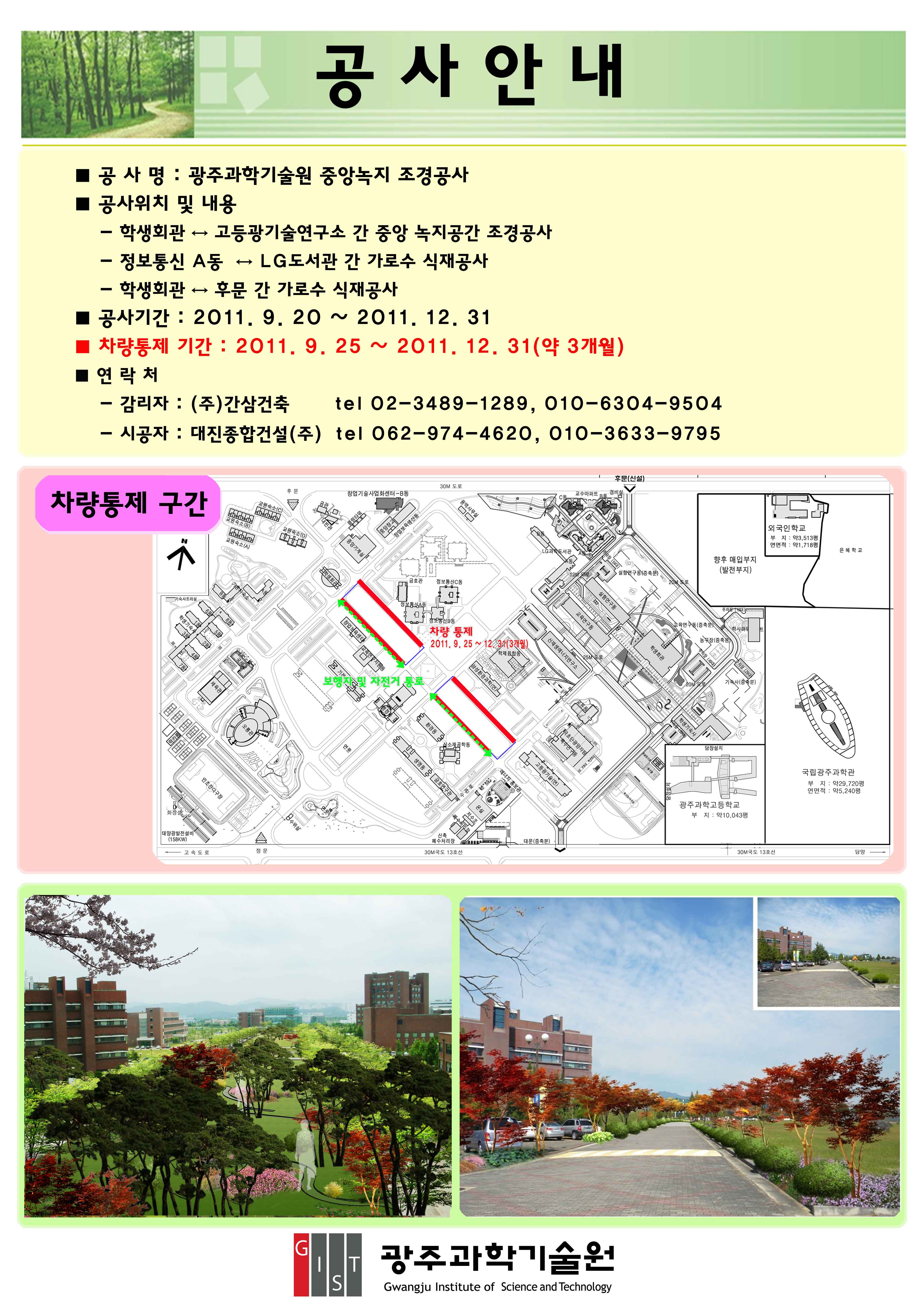 | 열람중 | [공사안내] 중앙녹지 조경공사로 인한 차량통제 안내 | 조국현 | 2011-09-19 | 5455 |