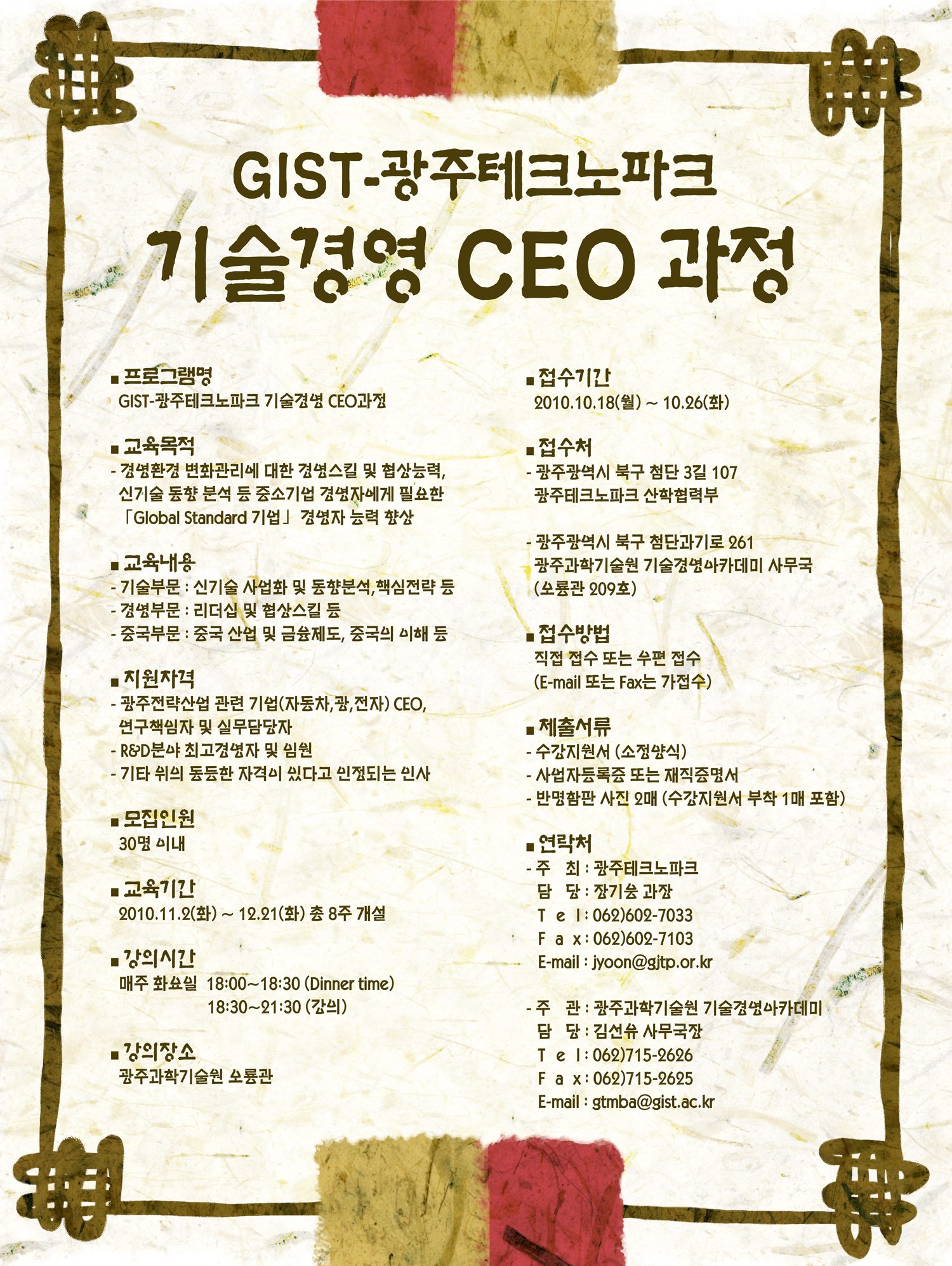 [GIST-광주테크노파크 기술경영 CEO 과정] 안내 제출서류 : 수강지원서(첨부), 사업자등록증 또는 재직증명서, 반명함판사진 2매 제출기한 : 2010. 11.26
