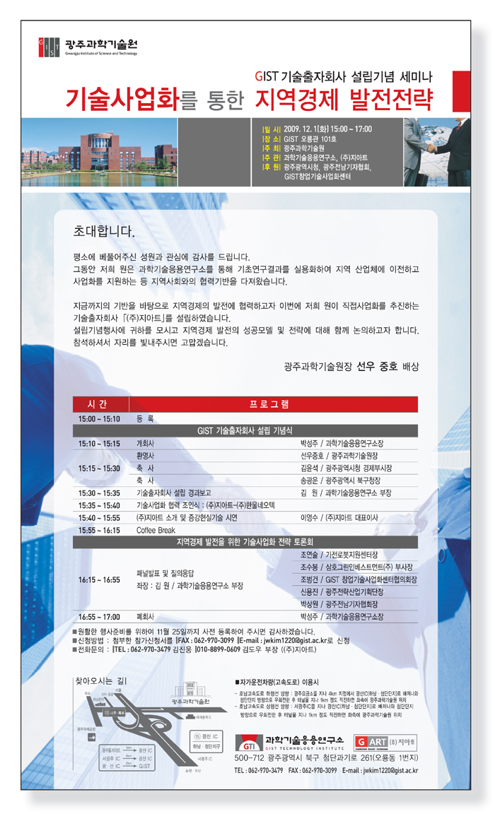 과학기술응용연구소에서 광주·전남 제1호 기술출자회사 (주)지아트 설립기념 및 지역기업과의 협력 및 연계를 통한 GIST 기술사업화 추진을 위하여 「GIST 지역경제 발전전략 세미나」를 아래와 같이 개최하고자 하오니