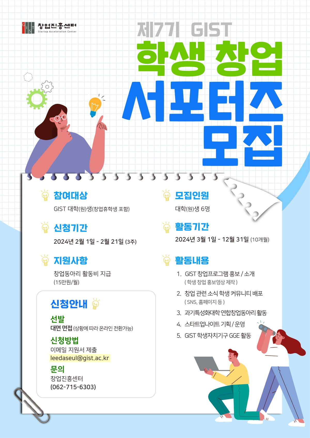 광주과학기술원 창업진흥센터는 GIST의 창업문화를 조성하고 창업프로그램의 홍보와 학생들과의 원활한 소통을 위한 2024년 창업서포터즈를 모집하고자 하오니 많은 관심과 참여를 부탁드립니다.