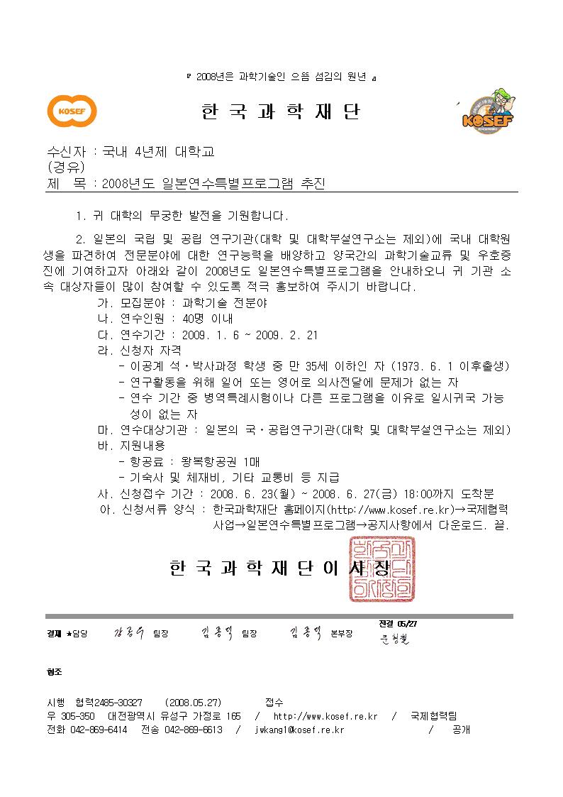 일본의 국립 및 공립 연구기관(대학 및 대학부설연구소는 제외)에 국내 대학원생을 파견하여 전문분야에 대한 연구능력을 배양하고 양국간의 과학기술교류 및 우호증진에 기여하고자 아래와 같이 2008년도 일본연수특별프로그램을 안내하오니 많은 신청 바랍니다.