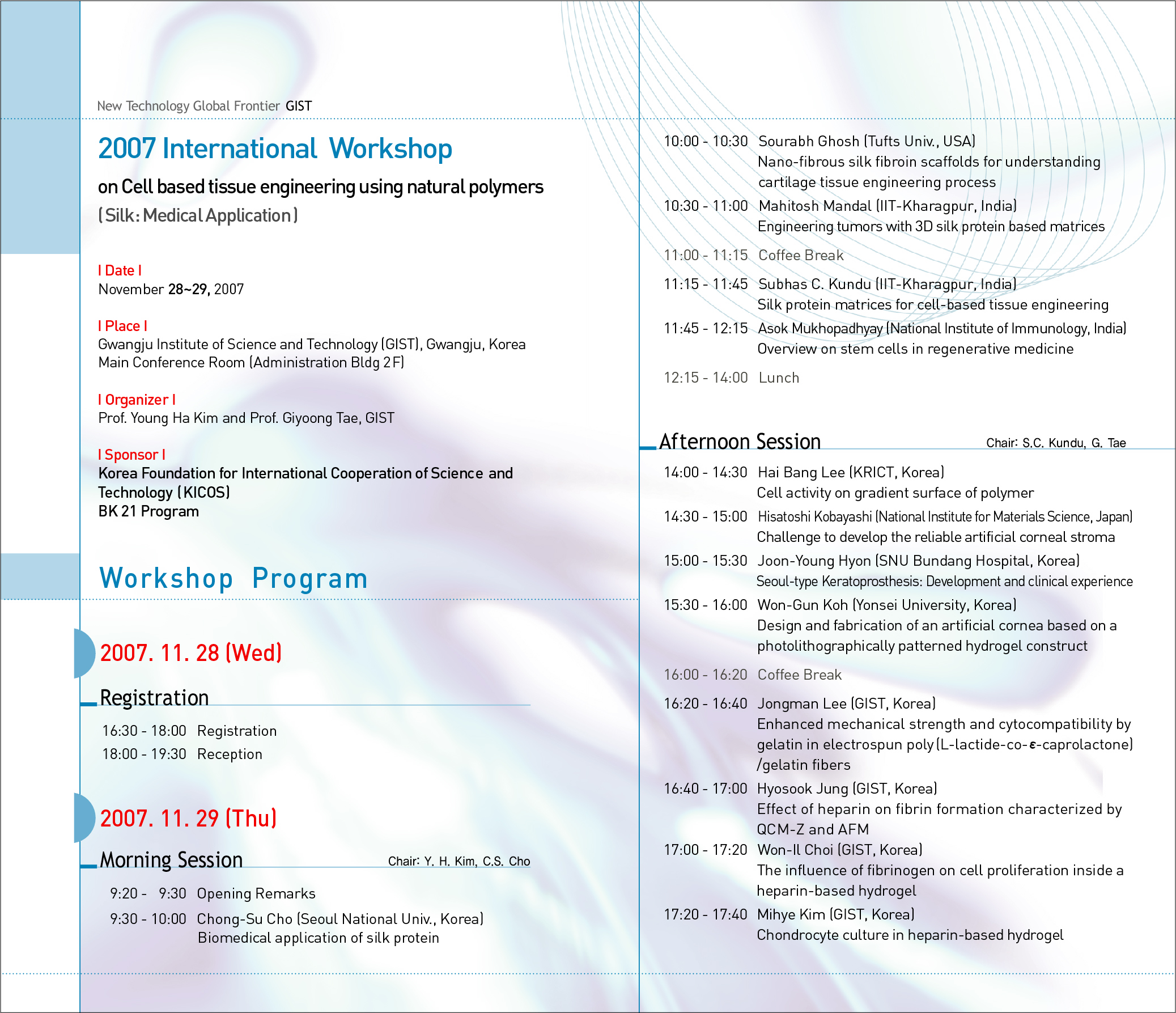 | 열람중 | 2007 International Workshop / on Cell based tissue engineering using natural polymers | 강현주 | 2007-11-28 | 8552 |