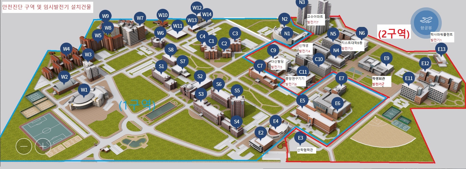 ※ 08시00분 부터 순차적으로 임시발전기를 운전을 시작하며 임시전원 연결과정 중 일시 정전이 있을 수 있습니다. 09시00분 (2구역) 파워플랜트 전체 전원 일괄 OFF(임시발전기 연결 제외)됩니다.