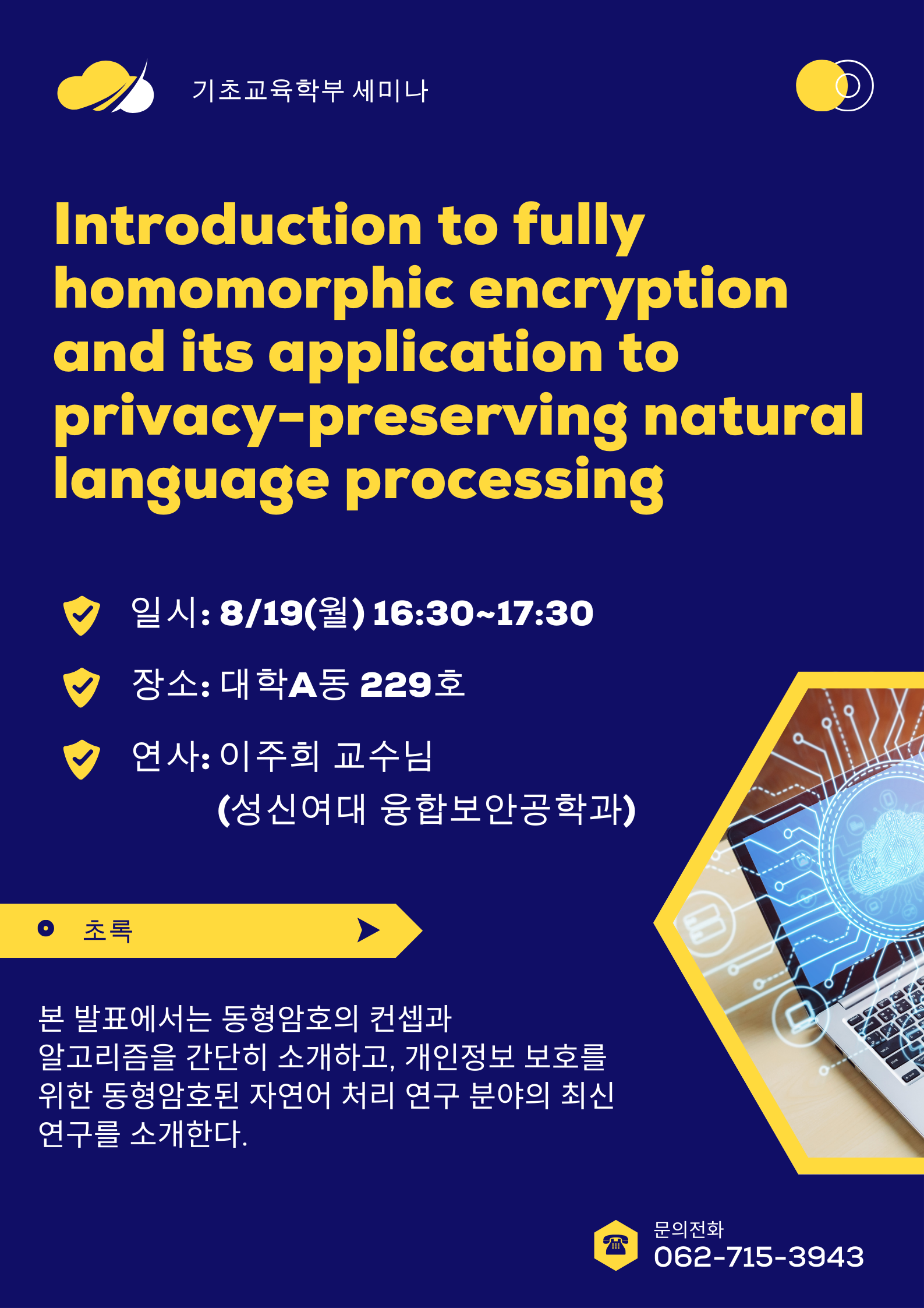 기초교육학부에서 동형암호의 컨셉과 알고리즘 및 개인정보 보호를 위한 동형암호된 자연어 처리 연구 분야의 최신 연구를 소개하는 세미나를 아래와 같이 개최하오니, 관심 있는 구성원께서는 참석하여 주시기 바랍니다.