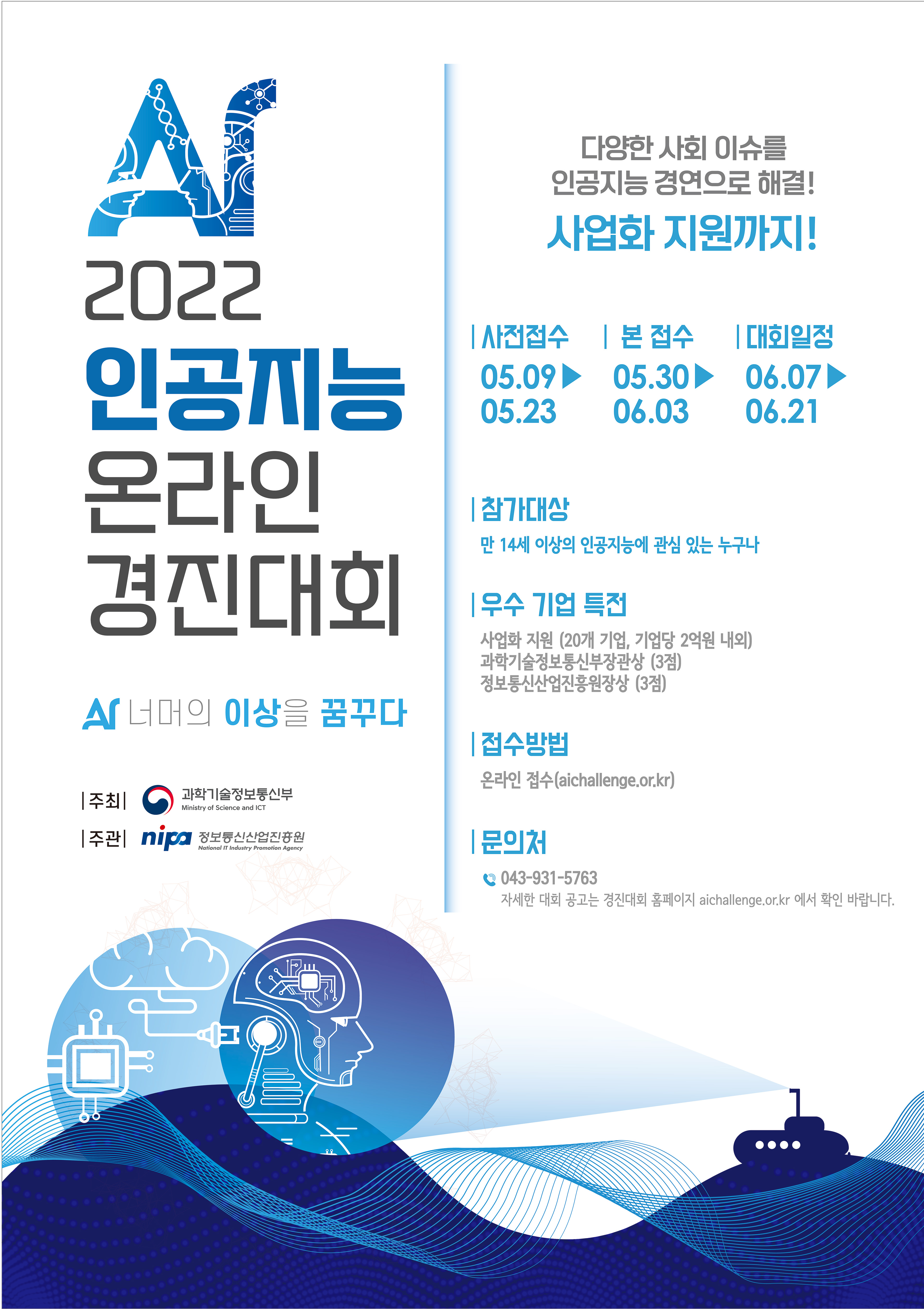 <2022 인공지능 온라인 경진대회>의 사전접수가 금주(5/9~5/23)부터 시작됩니다.
