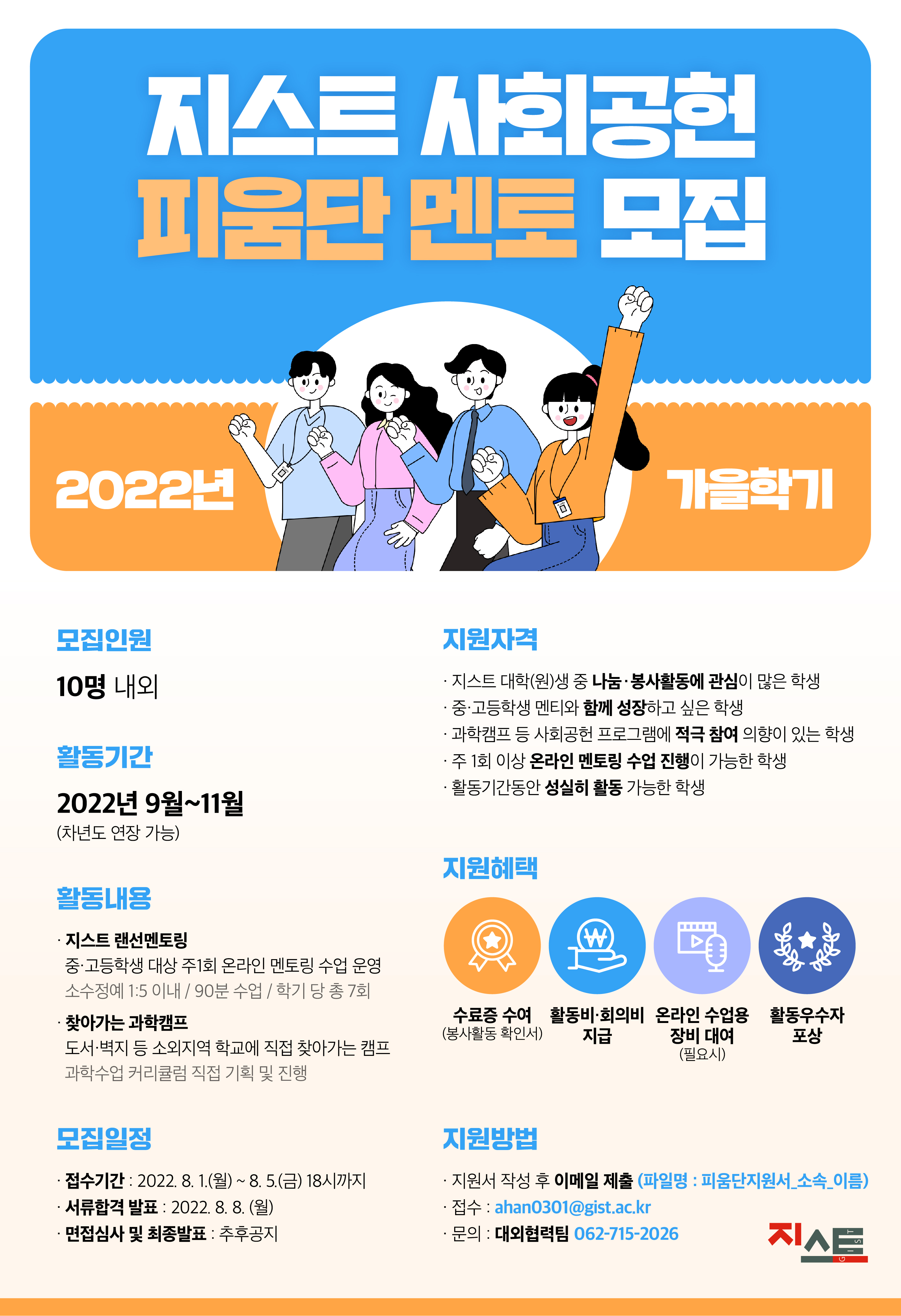 지스트 사회공헌단에서는「지식 나눔 프로그램: 랜선 멘토링 + 지스트 과학캠프」에서 활동할 멘토를 모집하고 있습니다.