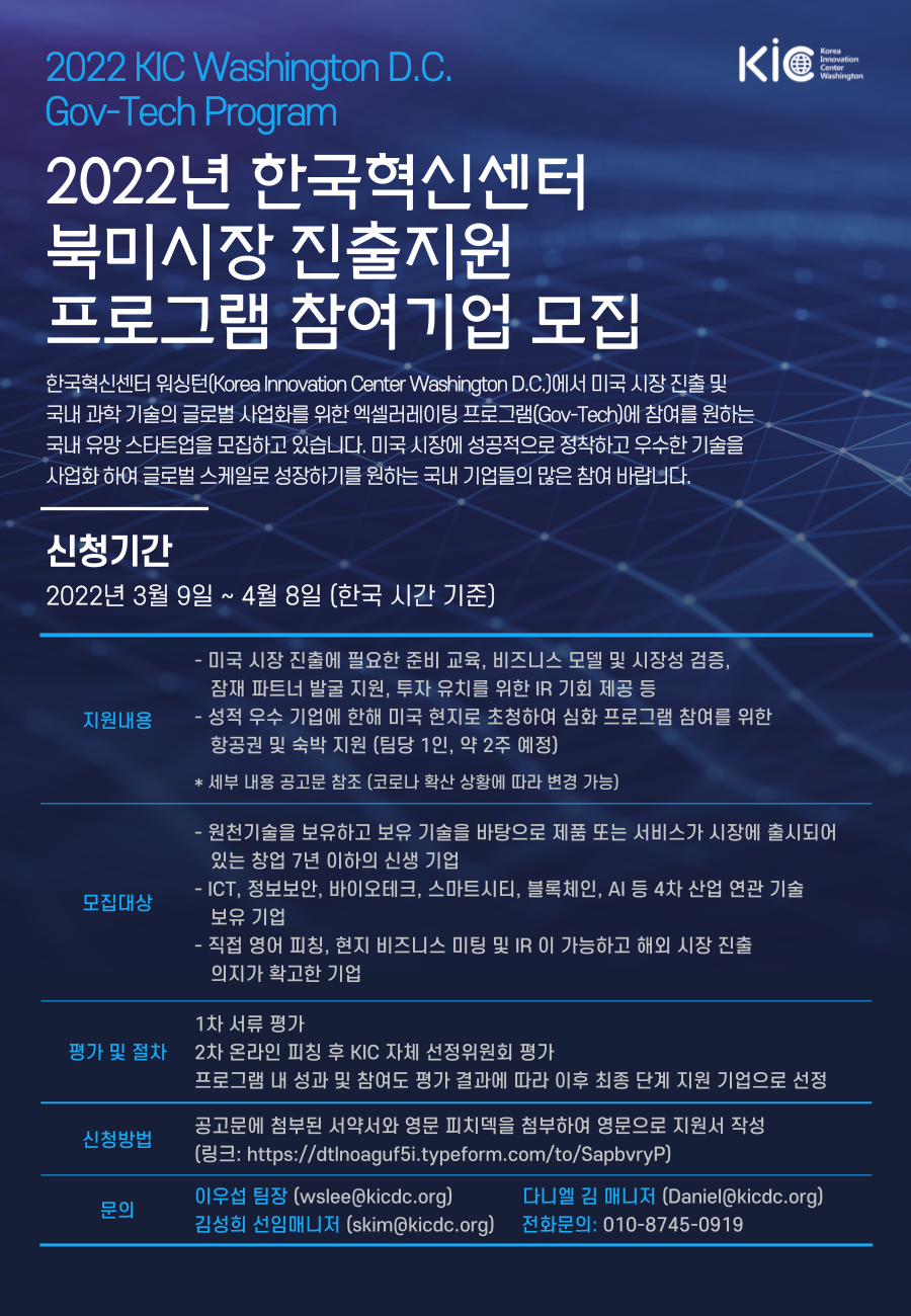 한국혁신센터(Korea Innovation Center Washington D.C., 이하 KIC DC) 워싱턴에서 미국 시장 진출 및 국내 과학 기술의 글로벌 사업화를 위한 엑셀러레이팅 프로그램 (Gov-Tech)에 참여를 원하는 국내 유망 스타트업을 모집하고 있습니다. 미국 시장에 성공적으로 정착하고 우수한 기술을 사업화하여 글로벌 스케일로 성장하기를 원하는 국내 기업들의 많은 참여 바랍니다.
