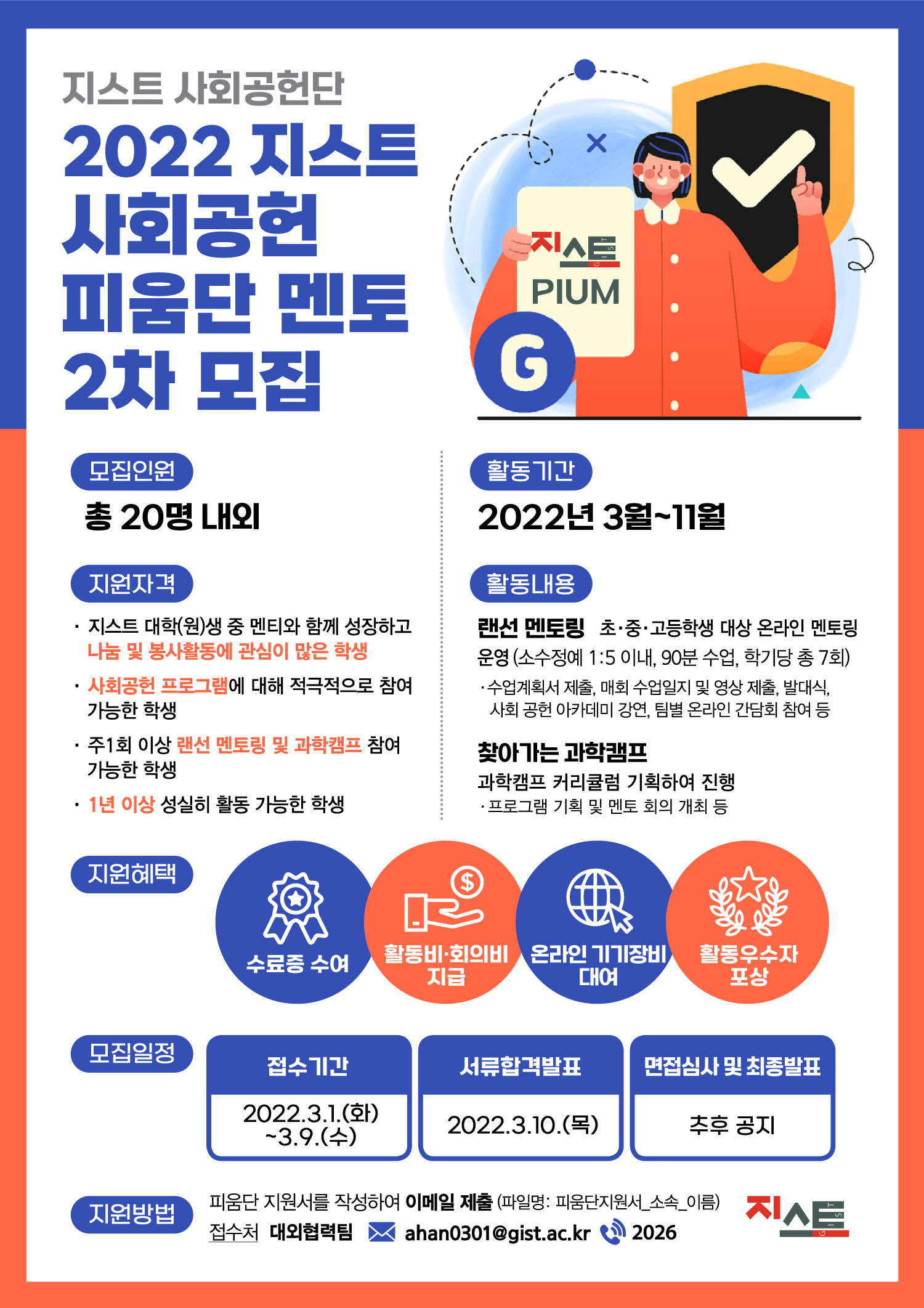 ![[대외협력팀] 2022년 지스트 사회공헌 피움단 멘토 2차 모집 안내 사진입니다. 자세한 내용은 하단에 있습니다.](http://www.gist.ac.kr/_prog/download/?editor_image=20220225140130424_QFEIAWTC.jpg)