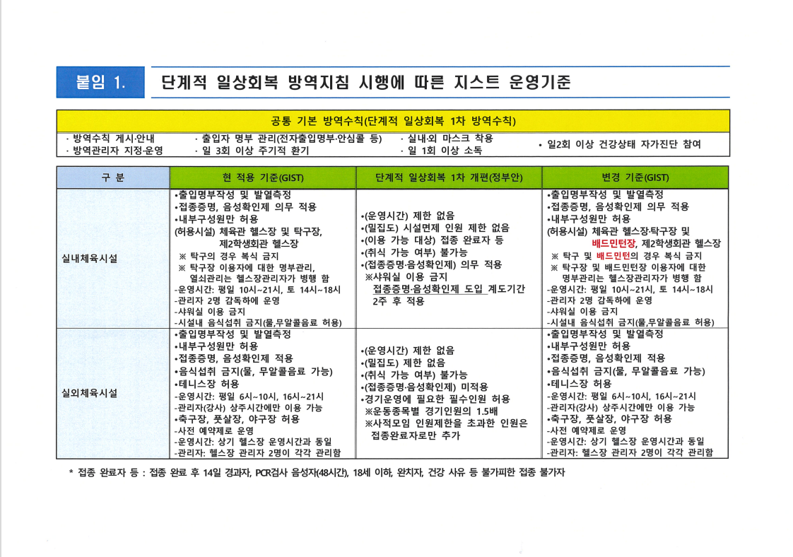 붙임 1. 단계적 일상회복 방역지침 시행에 따른 지스트 운영기준