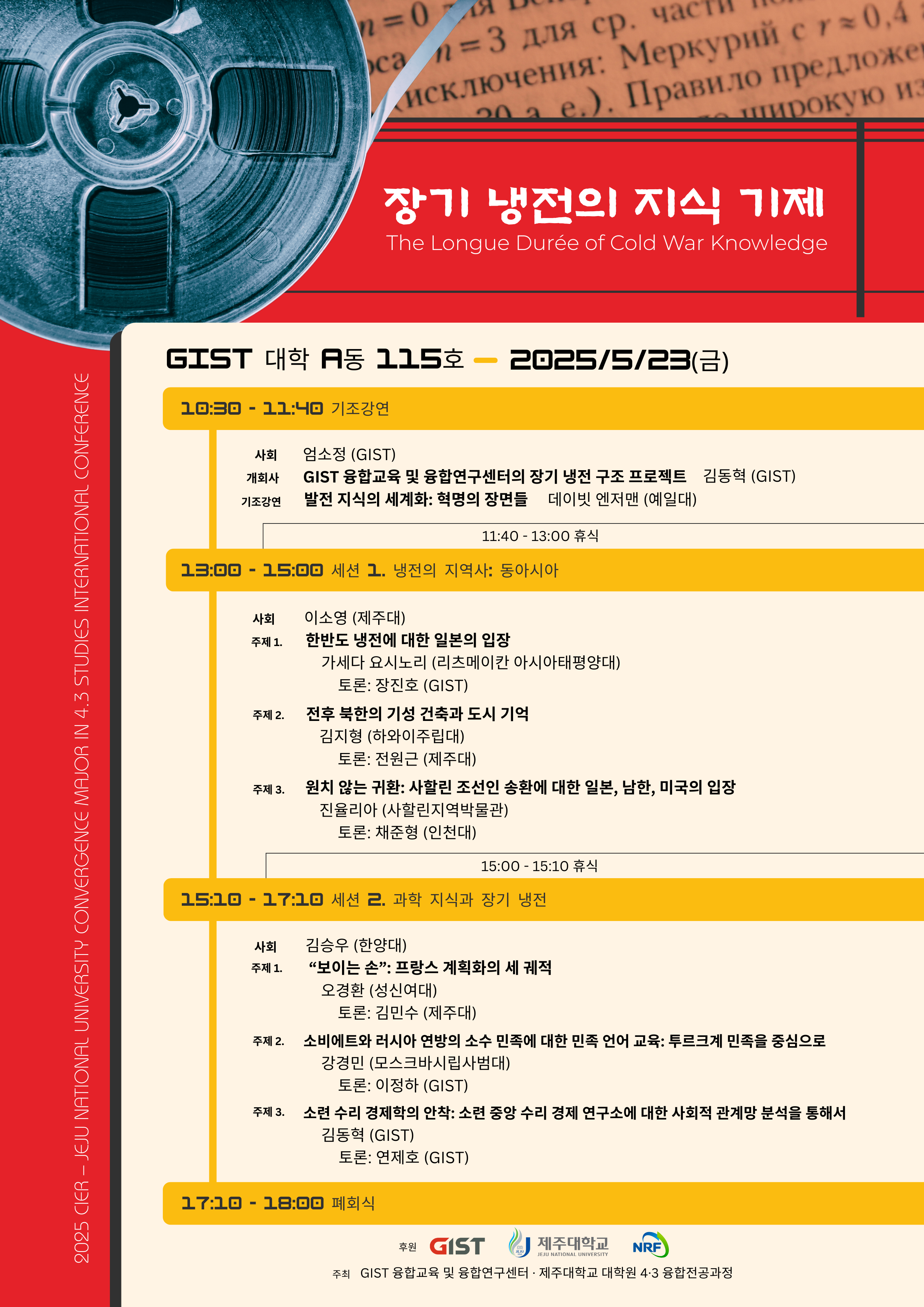 안녕하세요, 광주과학기술원 융합교육 및 융합연구센터와 제주대학교 대학원 4.3 융합전과과정에서 주최하고, 한국연구재단 등에서 후원하는 국제학술회의를 개최하게 되어 안내드립니다. 2025년 5월 23일(금) GIST대학 A동 114호에서 개최될 <장기 냉전의 지식기제 국제학술회의> 포스터를 아래와 같이 게시하오니, 관심있는 분의 많은 참석 부탁드립니다. 본 학술회의는 한-영 동시통역사가 전체 세션을 지원하므로 외국인 구성원께서도 참가 가능합니다. 인문사회과학부 드림 |