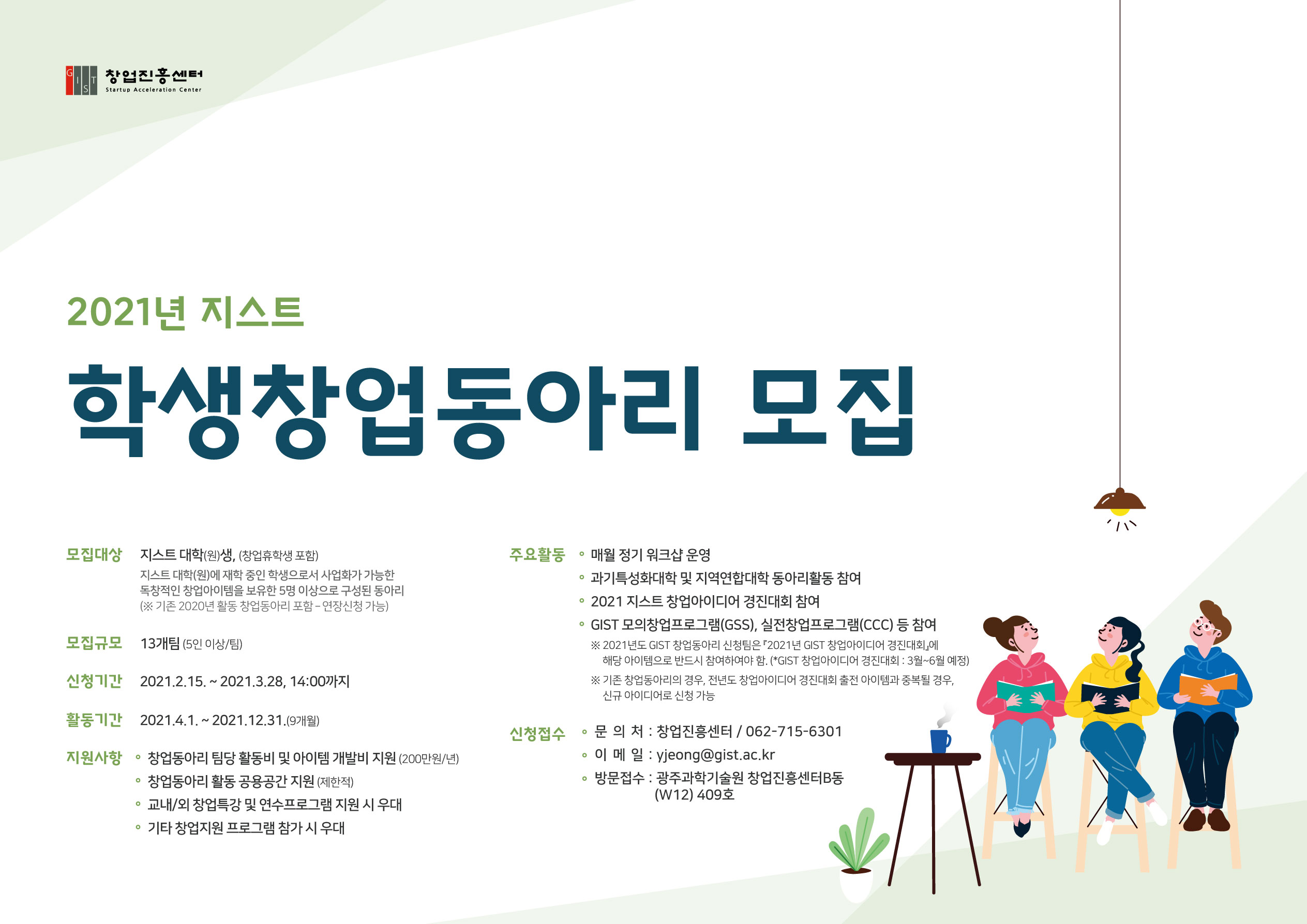 광주과학기술원 창업진흥센터는 원내 재학생들에게 창업동기를 부여하고 미래 혁신적인 기업가를 양성하기 위하여 참신한 아이디어와 창업의지를 갖춘 창업동아리를 모집합니다.