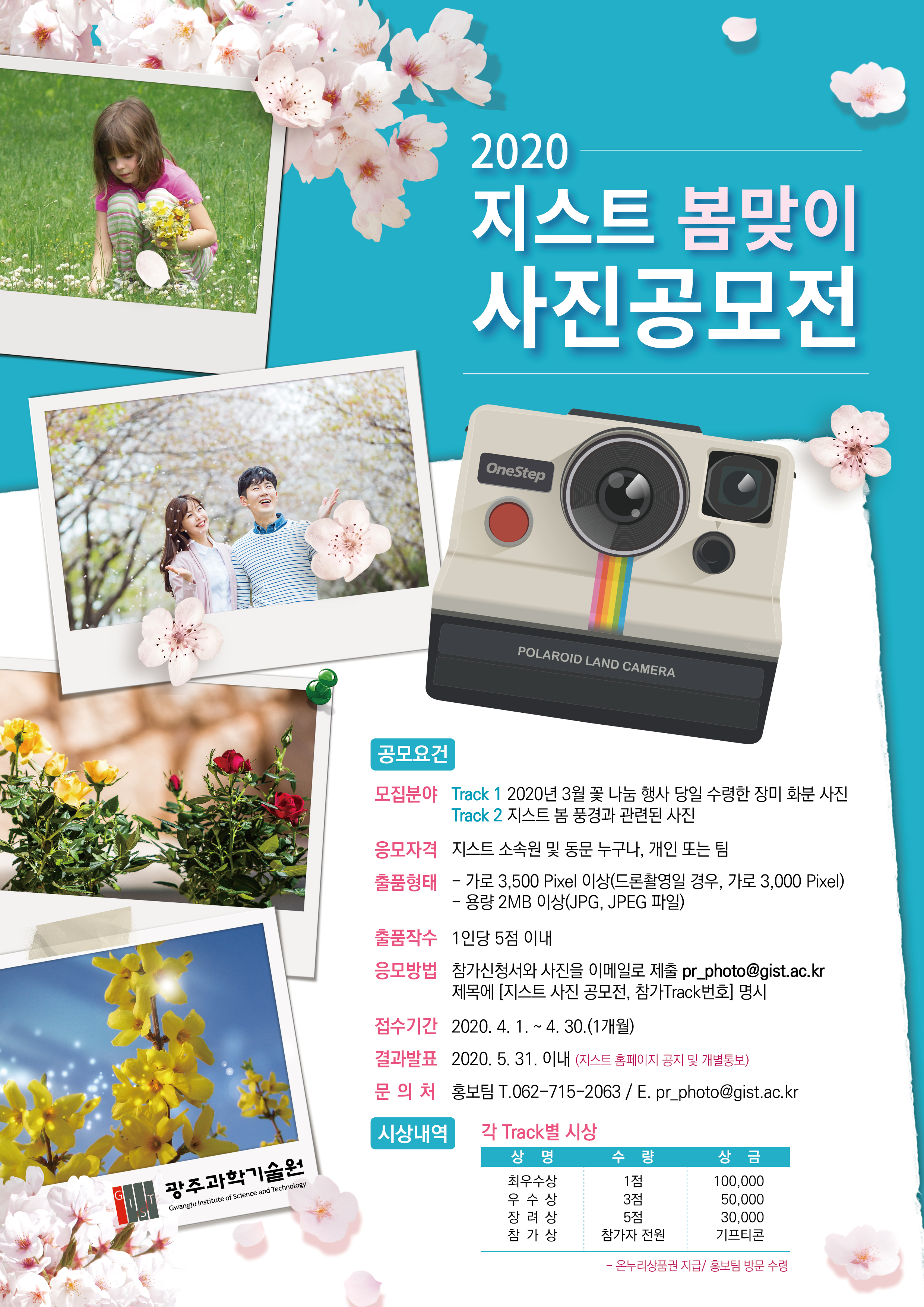 2020년 지스트 봄맞이 사진공모전 포스터 이미지 2. 모집 분야 – Track 1. 2020년 3월 28일 있었던 꽃 나눔 행사 당일 수령한 장미 화분 사진  – Track 2. 지스트 봄 풍경과 관련된 사진  응모 요강 – 응모 자격: 지스트 소속원 및 동문 누구나, 개인 또는 팀  – 응모 방법 : 참가신청서와 사진을 이메일로 제출(pr_photo@gist.ac.kr)    제목에 [지스트 사진 공모전, 참가 Track 번호] 명시  공모 일정  – 접수 2020. 4. 1.(수) ~ 2020. 4. 30.(목)  - 결과 발표 및 시상 2020. 5. 31.(일) 이내 발표 예정 출품 형태 – 가로 3,500px 이상(드론촬영일 경우, 가로 3,000 px)  - 용량 2MB 이상(JPG, JPEG 파일)  시상 내역  – 최우수상 (각 트랙 별 1점씩) : 온누리상품권 10만원 권  – 우수상 (각 트랙 별 3점씩) : 온누리상품권 5만원 권  – 장려상 (각 트랙 별 5점씩) : 온누리상품권 3만원 권 ※ 우수작 시상을 비롯해 참가자 전원에게 기프티콘이 지급될 예정이며, 당선작은 지스트 홈페이지와 SNS 채널 IPTV.2021년 탁상달력·각종 홍보물 등에 활용될 수 있습니다.