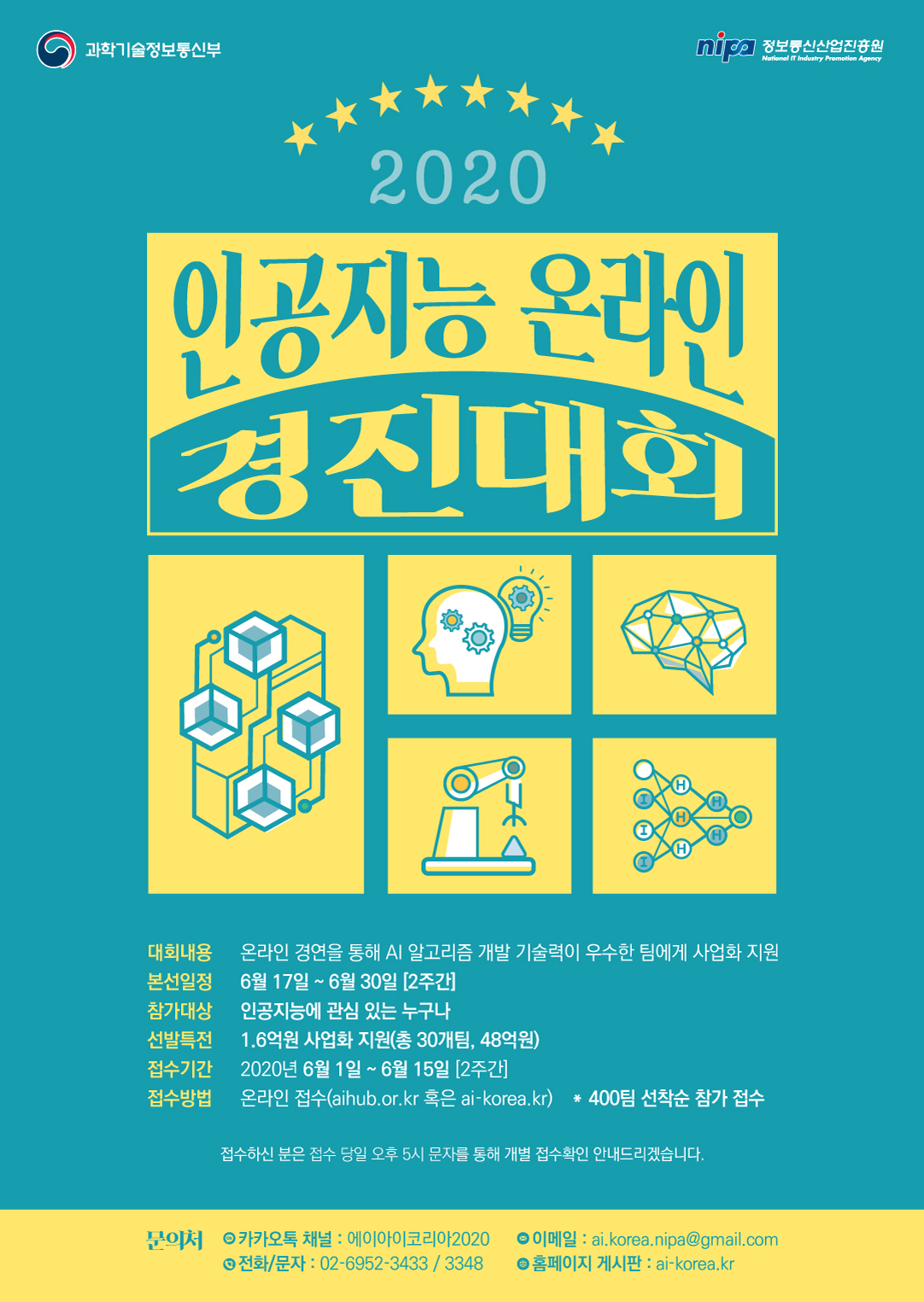 AI 중소·벤처 기업 육성 및 AI 기술 확대를 위해 과학기술정보통신부에서 주최하고 정보통신산업진흥원에서 주관하여 진행되는 「2020년 인공지능 온라인 경진대회」를 안내해드립니다.