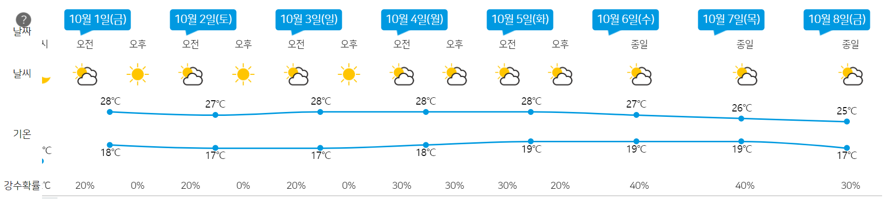 보시다시피 적어도 다음 주 후반까지 낮 기온이 28도까지 올라갈 거라는 예보를 볼 수 있습니다.