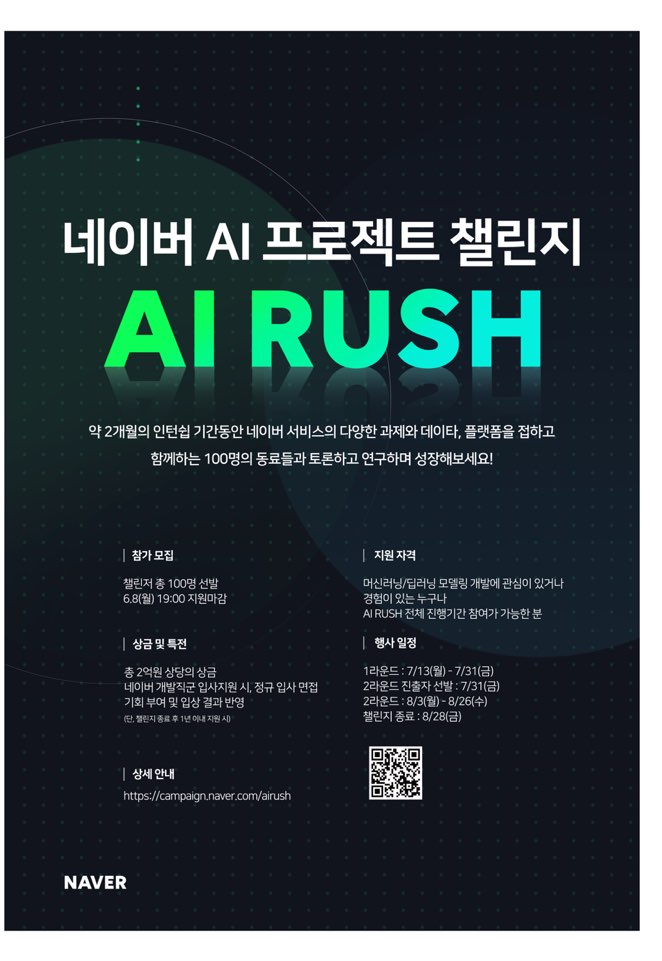 - 네이버 AI 실무진들과 함께 네이버의 실제 서비스인 블로그·카페·쇼핑·댓글·플레이스 등의 과제들을 해결하는 2달간의 네이버 AI 프로젝트 챌린지 입니다.