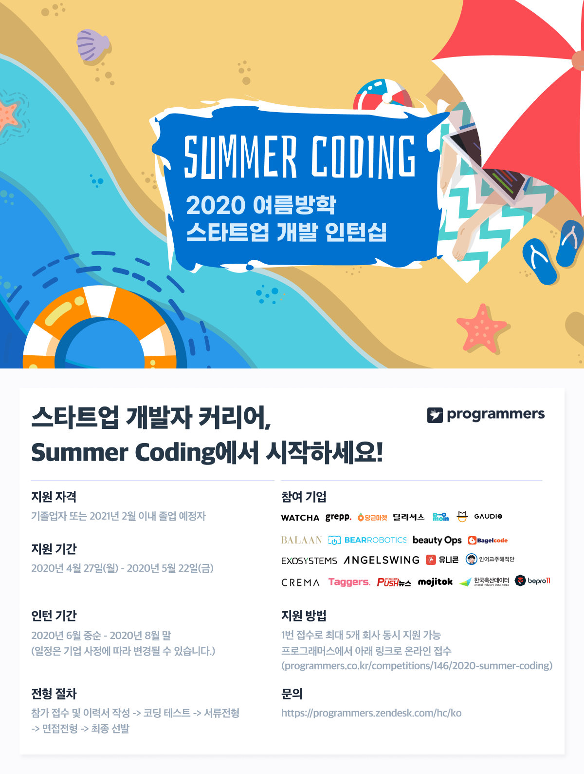 ummer Coding은 프로그래머스가 주최하는 스타트업 인턴 개발자 매칭 프로그램으로, 정규직 전환 계획을 가진 20여 개 스타트업이 참여합니다. 웹 개발자, 앱 개발자 등 다양한 포지션의 인턴 개발자를 채용 중이니 많은 관심 부탁드립니다!