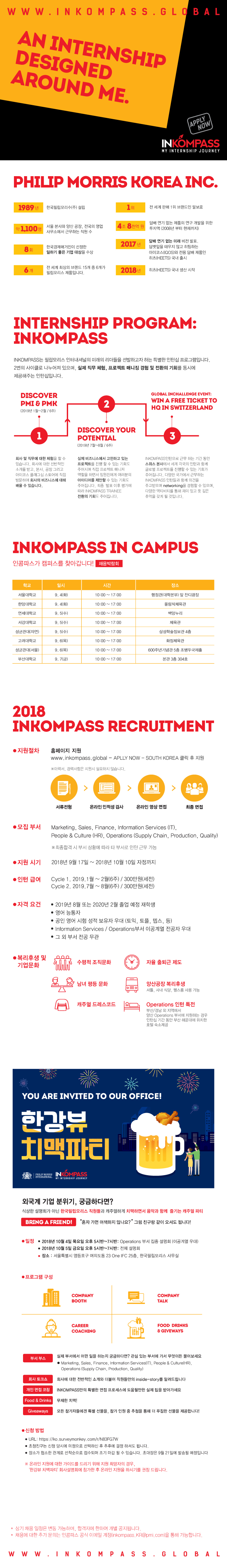 외국계 기업 분위기, 궁금하다면? 식상한 설명회가 아닌 한국필립모리스 직원들과 캐주얼하게 치맥하면서 음악과 함께 즐기는 캐주얼 파티를 진행합니다. l 2018년 10월 4일 목요일 오후 5시반 ~ 7시반 : Operations 부서 집중 설명회 (이공계열 우대) l 2018년 10월 5일 금요일 오후 5시반 ~ 7시반 : 전체 설명회 l 장소 : 서울특별시 영등포구 여의도동 23 One IFC 25층, 한국필립모리스 사무실