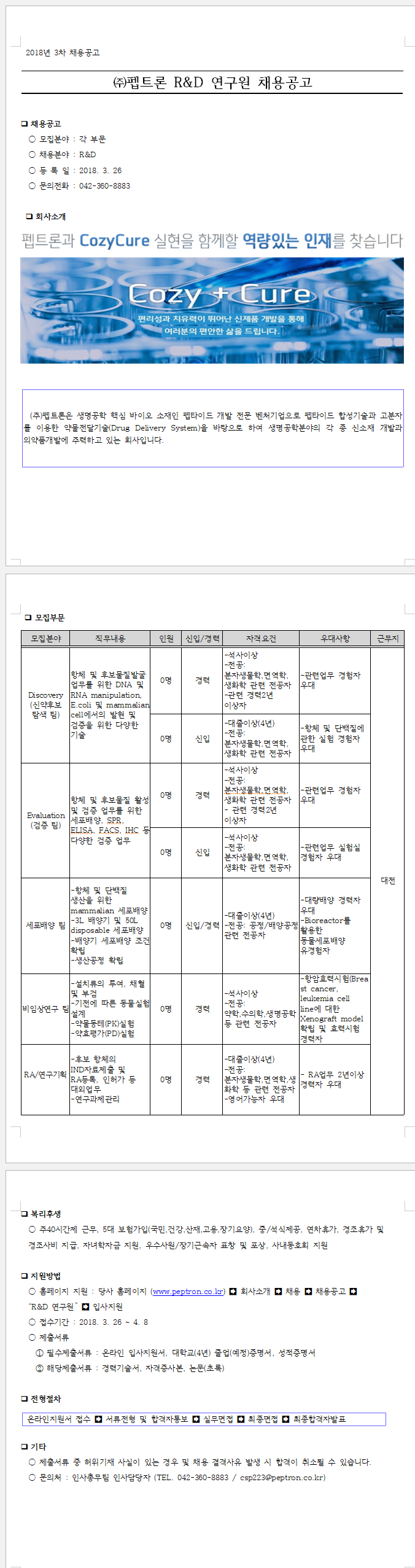 ○홈페이지 지원: 당사 홈페이지 (www.peptron.co.kr) → 회사소개 → 채용 → 채용공고 → "R&D 연구원" → 입사지원 ○접수기간: 2018.3.26 ~ 4.8 ○제출서류 ①필수제출서류:온라인 입사지원서, 대학교(4년)졸업(예정)증명서, 성적증명서 ②해당제출서류:경력기술서, 자격증사본, 논문(초록)