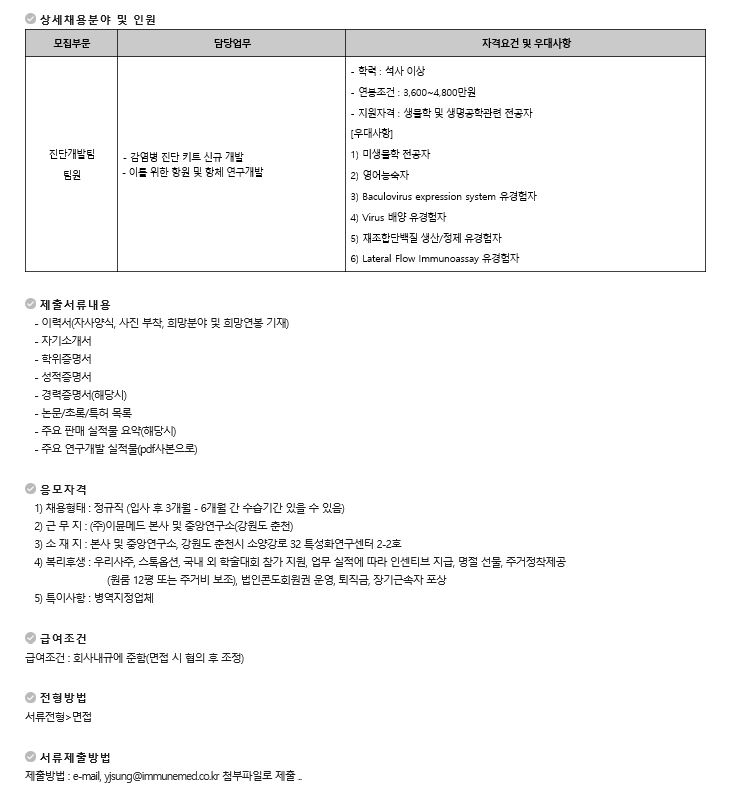 이뮨메드 진단개발팀 직원 모집(~4.8)