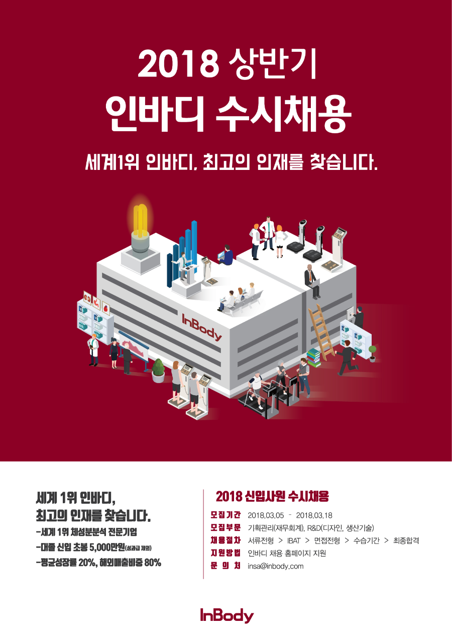 세계 1위 체성분분석 전문기업, 인바디에서 2018년 상반기 신입사원을 모집합니다.