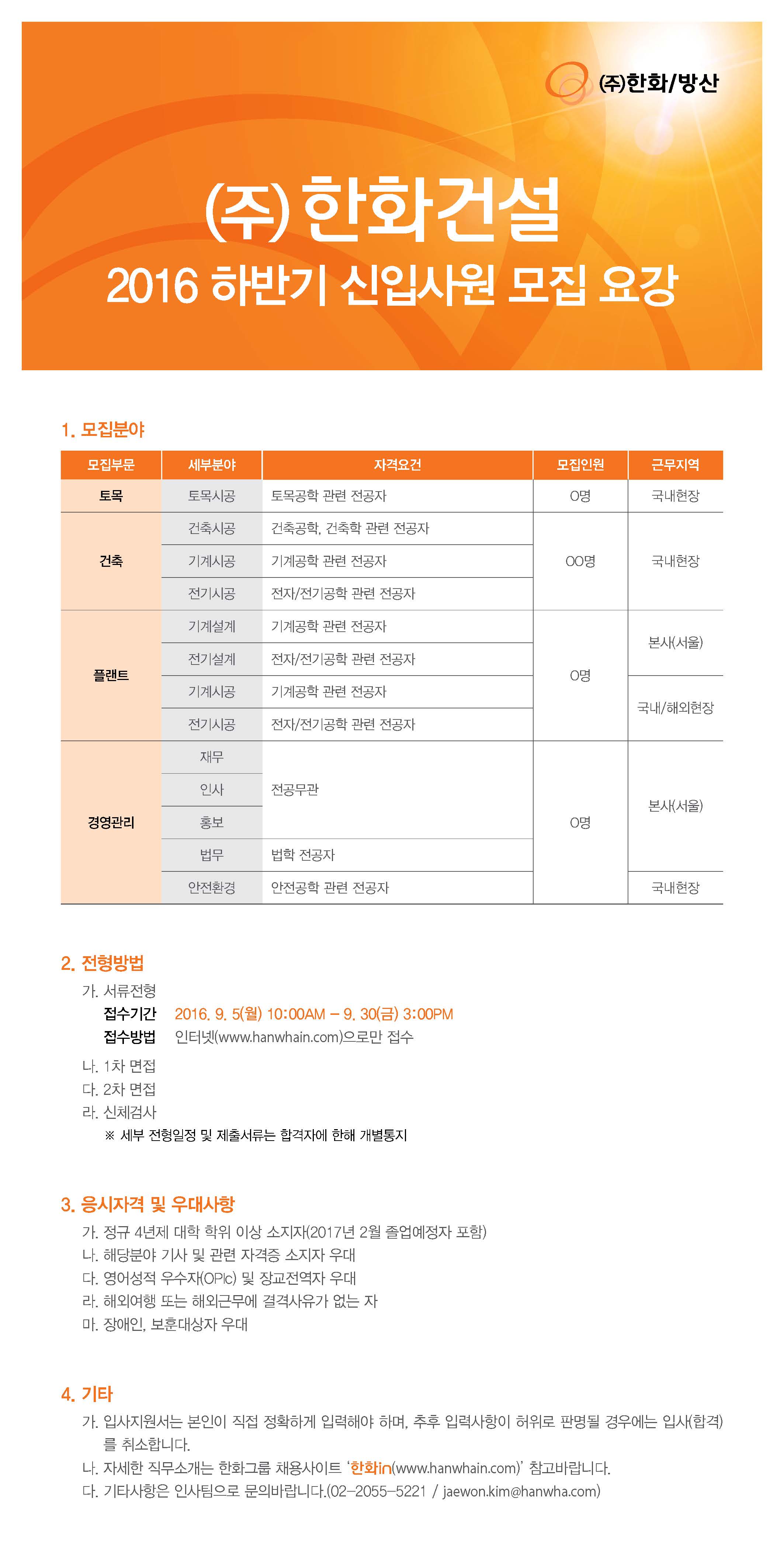 -채용관련 문의: 한화건설 인사팀 (02-2055-5221, jaewon.kim@hanwha.com)