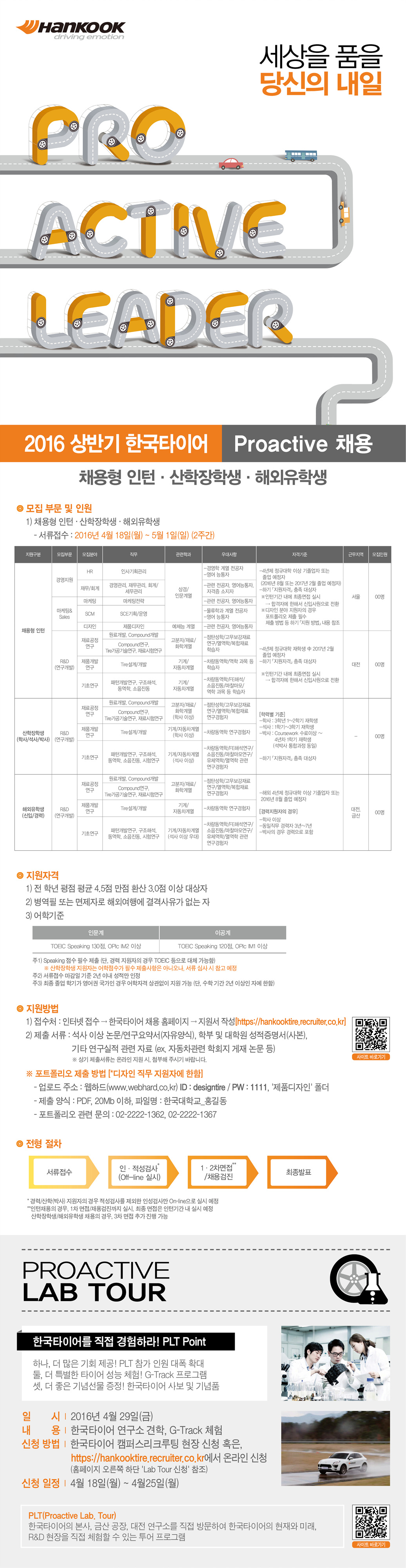 2016 상반기 한국타이어 Proactive 채용(채용형 인턴/산학장학생/해외유학생) 전형에 많은 참여 부탁드립니다.