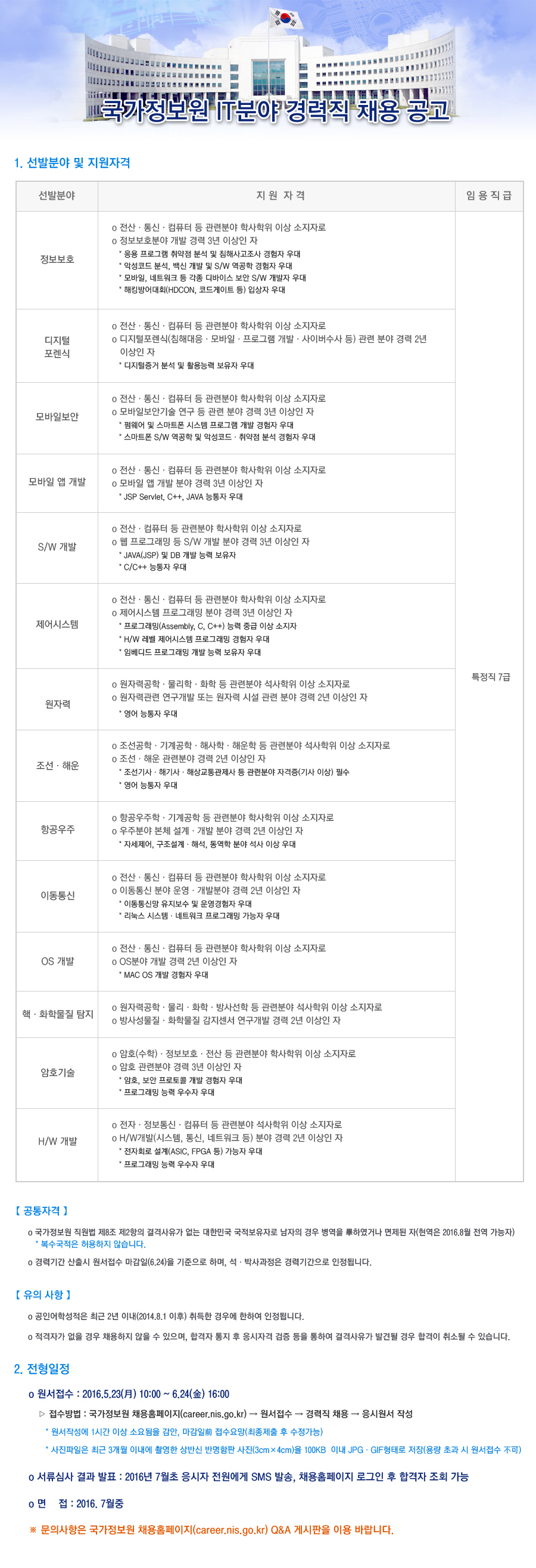붙임과 같이 국가정보원 IT분야 경력진 채용 공고분을 게시합니다.