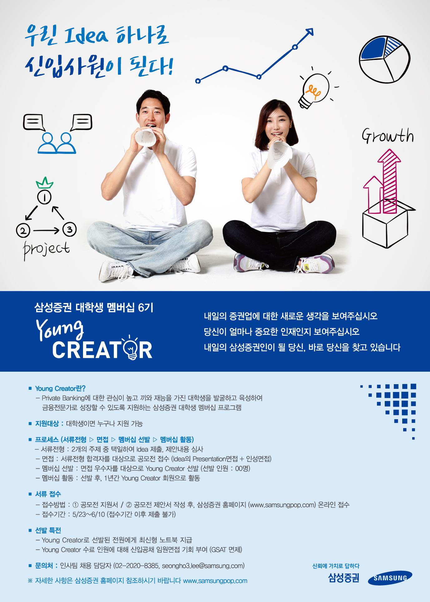 아이디어 하나로 신입사원이 될 수 있는, "2016 삼성증권 대학생 멤버십 6기 Young Creator" 모집 전형에 많은 지원 부탁 드립니다.